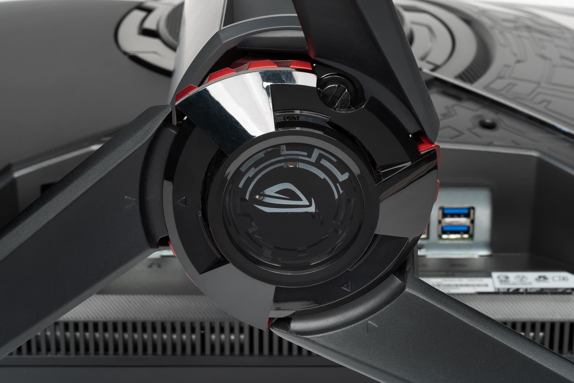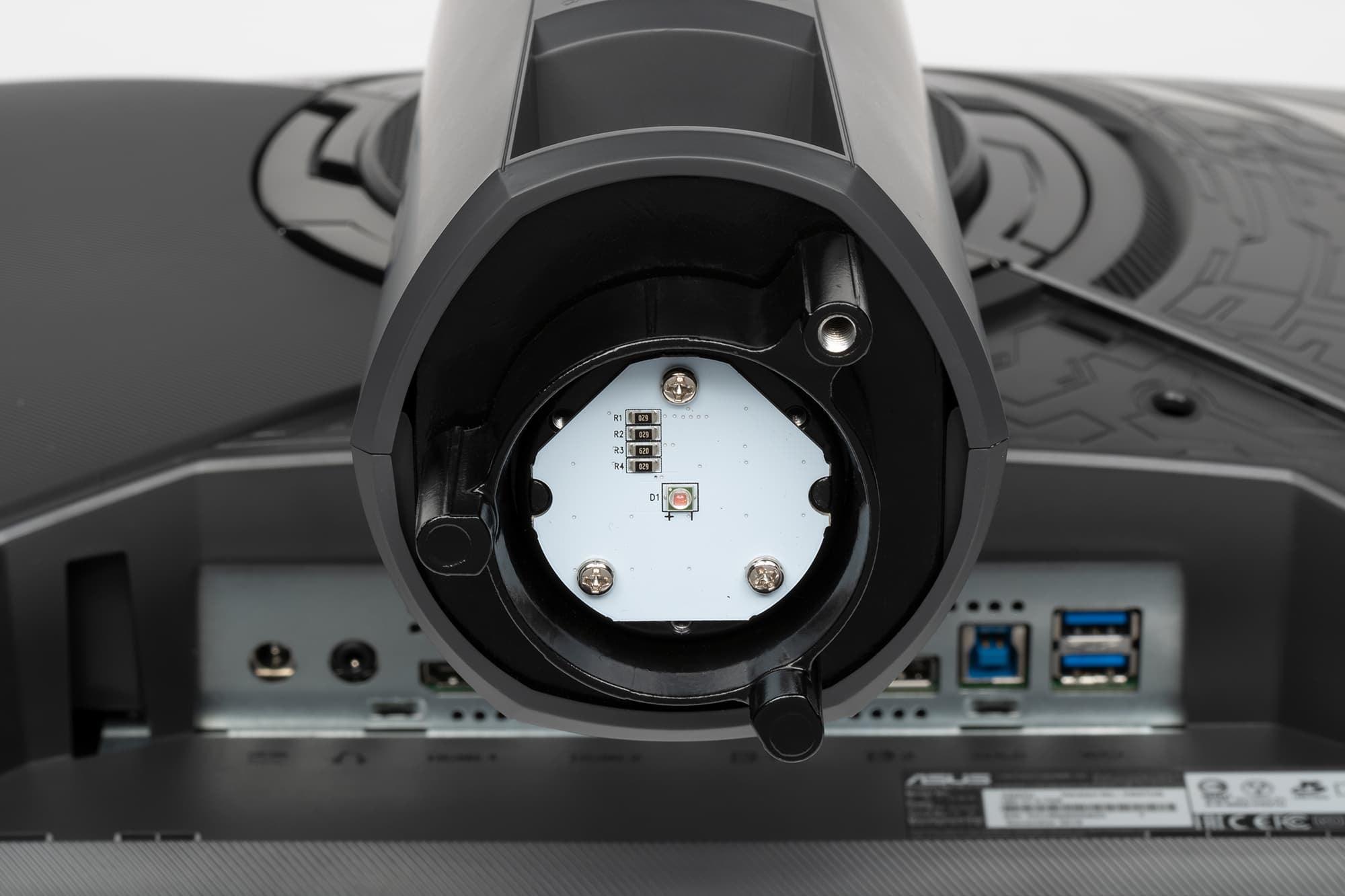 На верхнем торце стойки есть вставка из прозрачного пластика с трафаретным изображением логотипа ROG. В нижний торец стойки встроена светодиодная подсветка красного свечения. Она проецирует на поверхность стола, на котором стоит монитор, замысловатый рисунок с логотипом ROG или то, что нарисовал пользователь. Один светодиод закрывается крышкой, со сменными круглыми вставками.