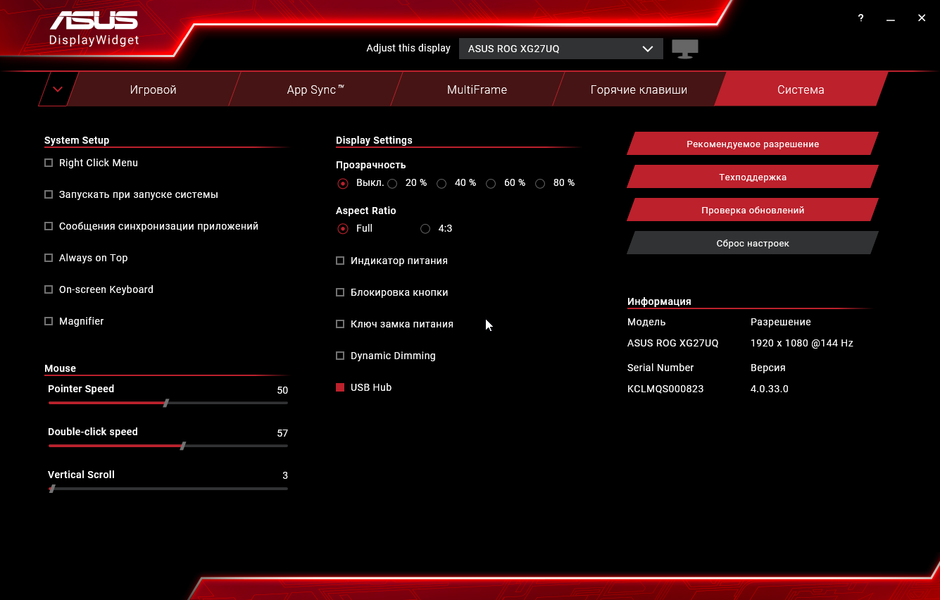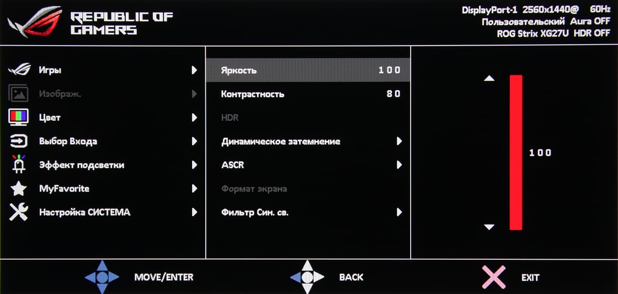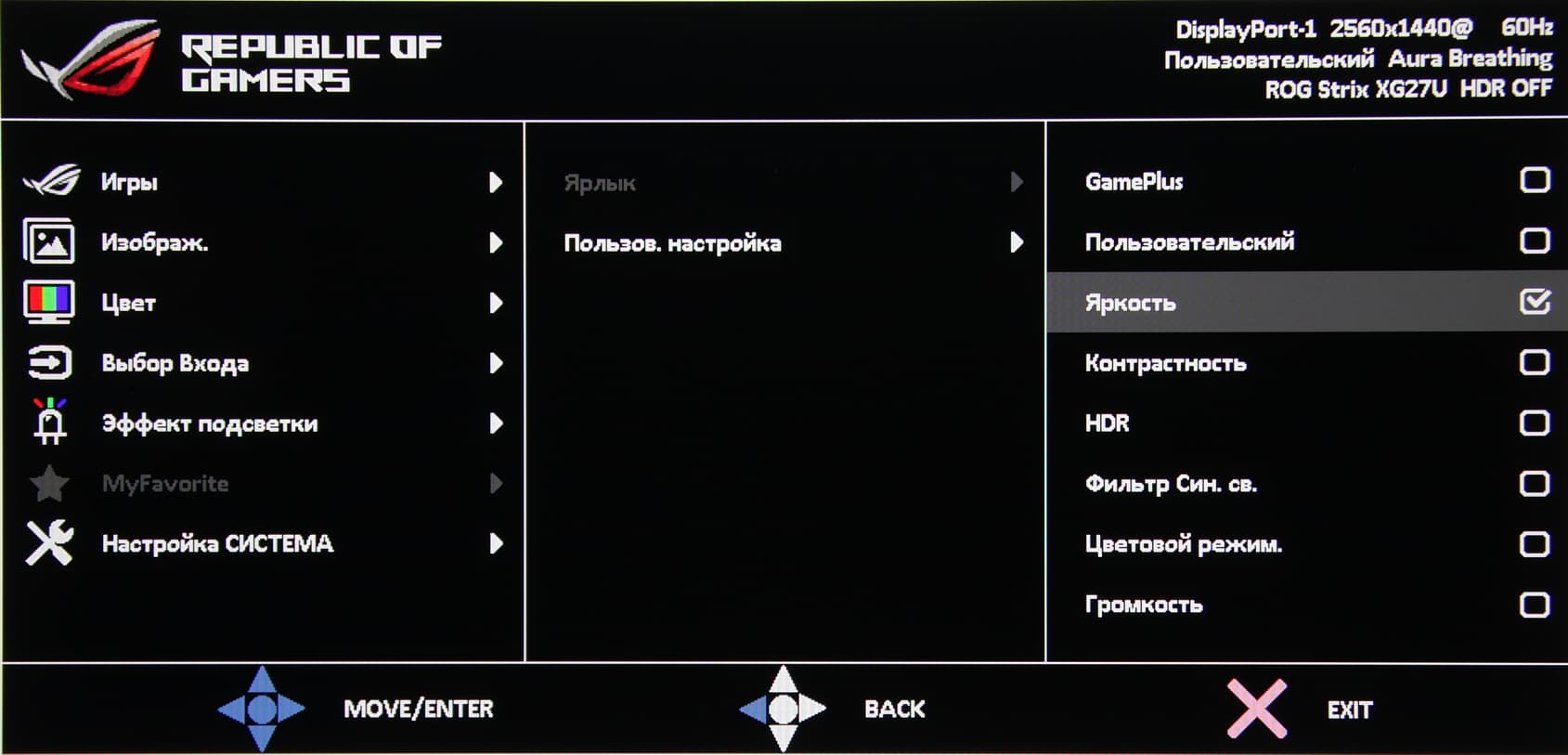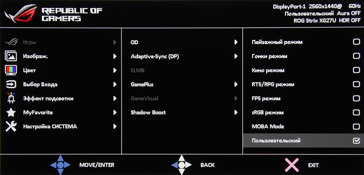 Самая нижняя кнопка — это кнопка питания. Работу всех кнопок или только кнопки питания можно заблокировать в меню. Основное меню большое. Размеры текста в меню обеспечивают приемлемую читаемость. При настройке изображения меню остается на экране, что немного мешает оценке вносимых корректировок. Настраивается прозрачность фона и задержка автоматического выхода из меню. Настройки монитора можно сохранить в одном из четырех профилях. Присутствует русская версия экранного меню. Кириллический шрифт достаточно ровный и читаемый. Качество перевода на русский язык хорошее, но местами есть странности. На сайте компании мы нашли ссылки на программы Asus Aura Sync и Asus DisplayWidget, драйвер монитора и на полные версии руководства в виде PDF-файлов (русская версия присутствует). Программа Asus DisplayWidget позволяет настраивать монитор с компьютера.