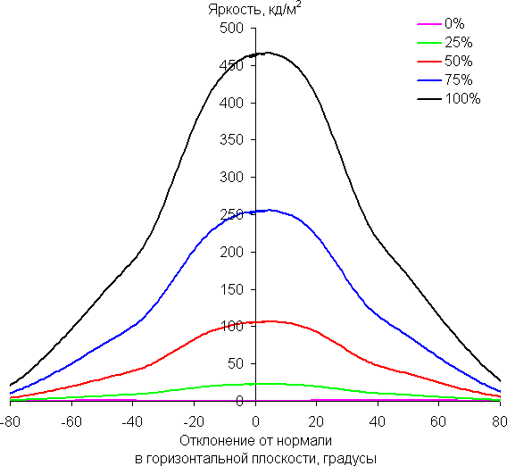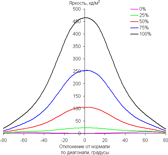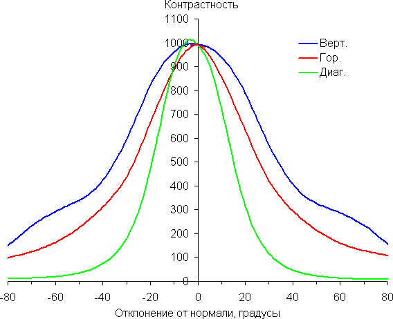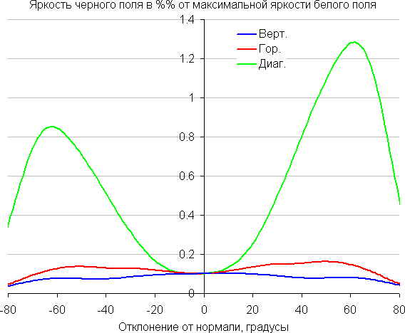 По скорости падения яркости углы обзора не очень широкие, что для IPS не типично. Отметим примерно одинаковый характер уменьшения яркости при отклонении от перпендикуляра к экрану во всех трех направлениях, при этом графики не пересекаются во всем диапазоне измеряемых углов. При отклонении в диагональном направлении яркость черного поля начинает резко возрастать уже при 20°-30° отклонения от перпендикуляра к экрану. Если сидеть не очень далеко от экрана, то черное поле по углам будет заметно светлее, чем в центре (фотография черного поля это показывает). Контрастность в диапазоне углов ±82° в случае отклонения по диагонали приближается к отметке 10:1, и опускается ниже при отклонении в одном направлении более чем на 65°.