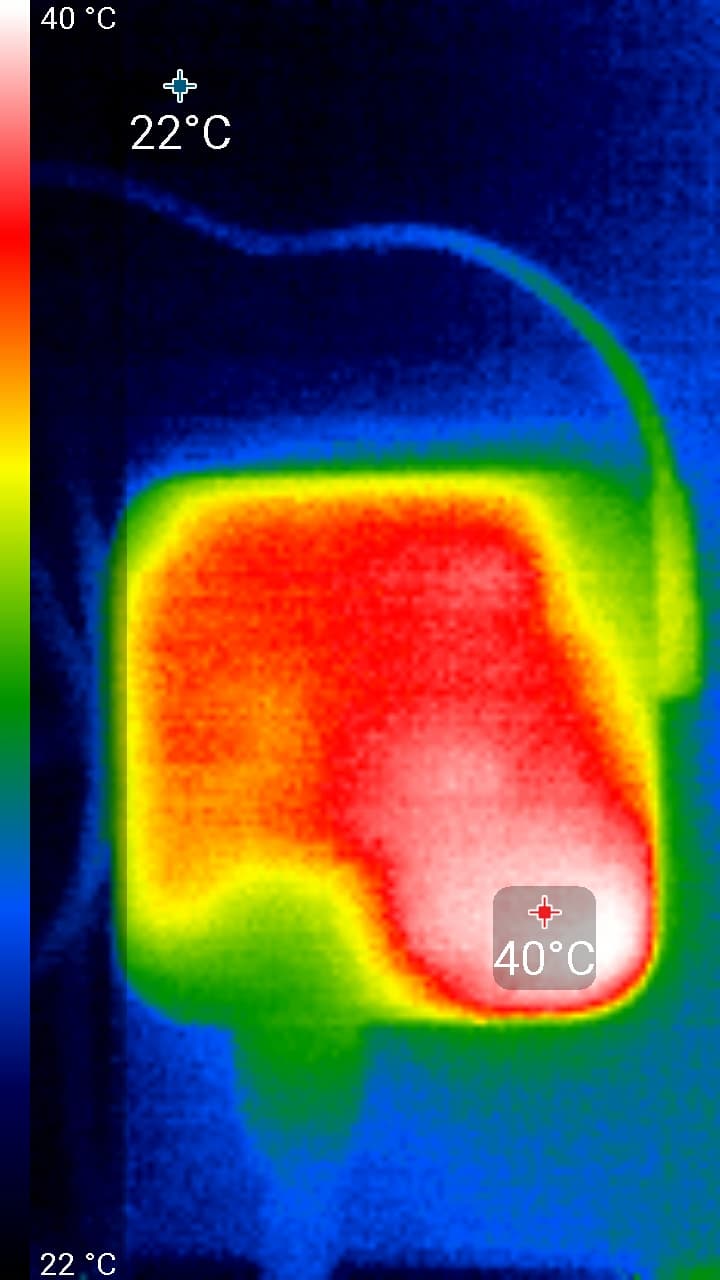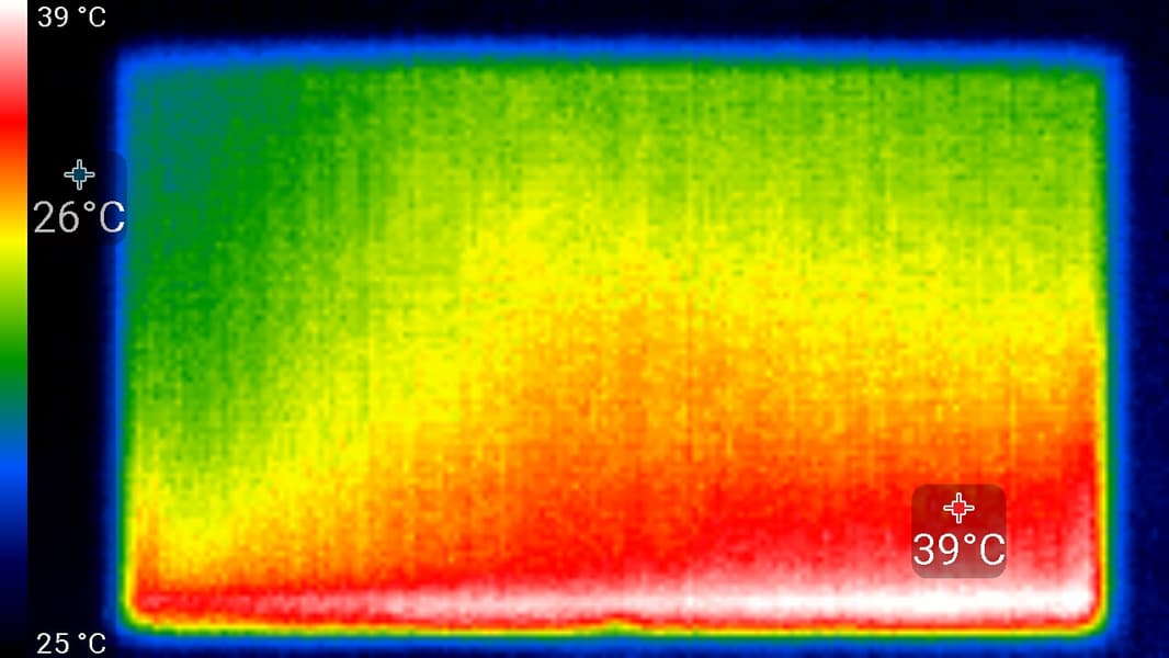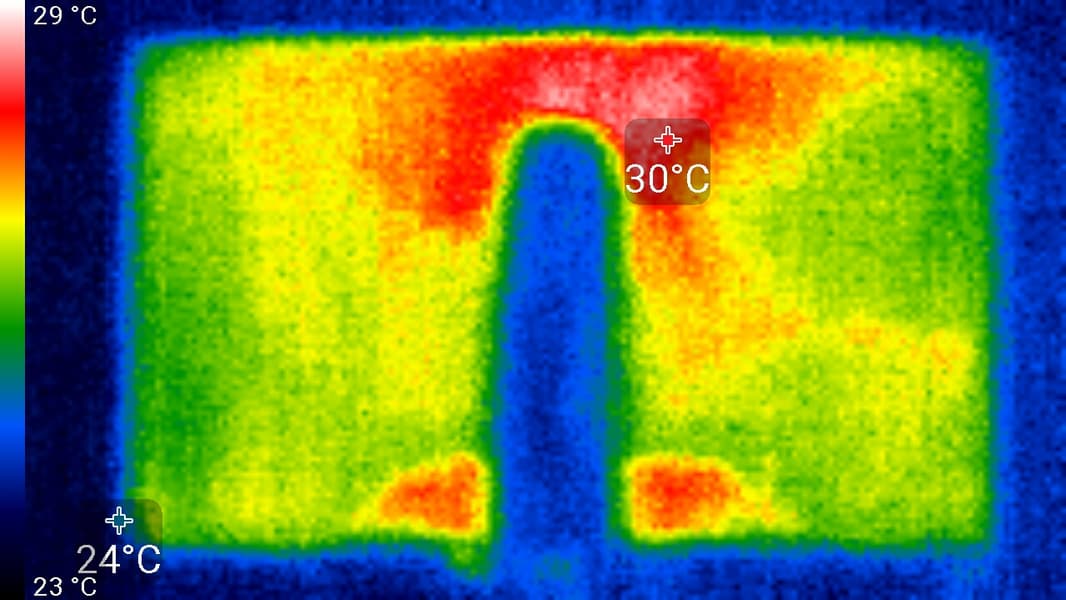 Снимки с более близкого расстояния показали, что нижний край экрана нагрелся до 43 °C максимум — видимо, внизу находится светодиодная линейка подсветки экрана. Нагрев сзади незначительный. Корпус БП нагрелся всего до 40 °C, видимо, у него есть запас по мощности.