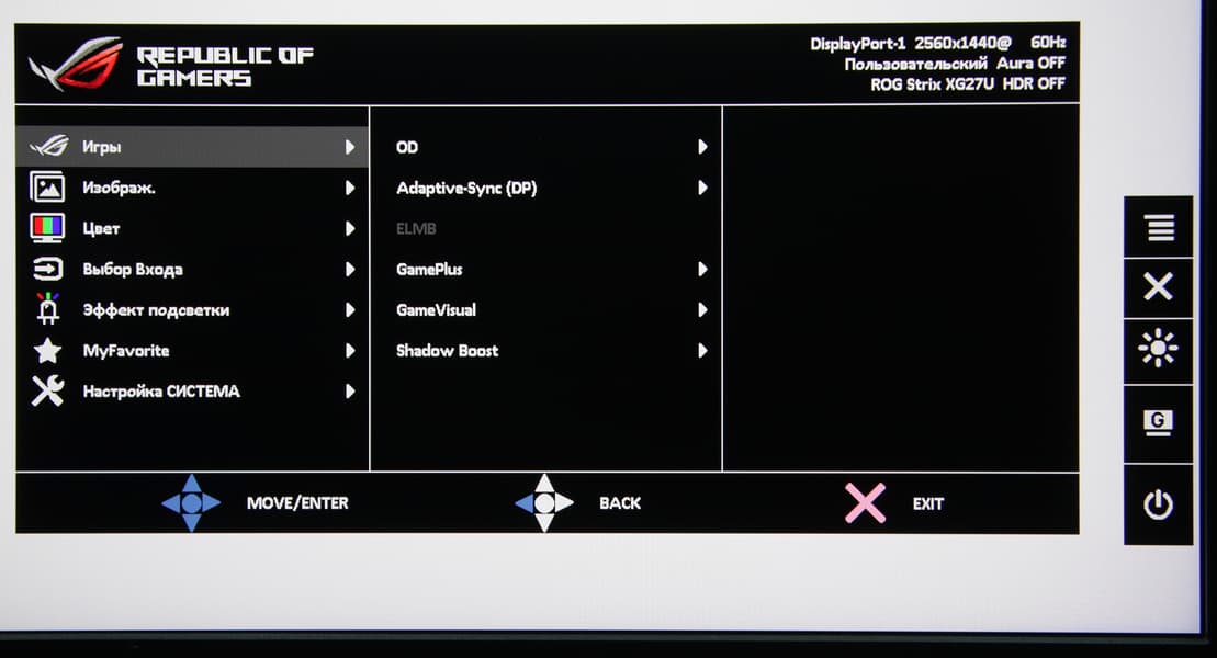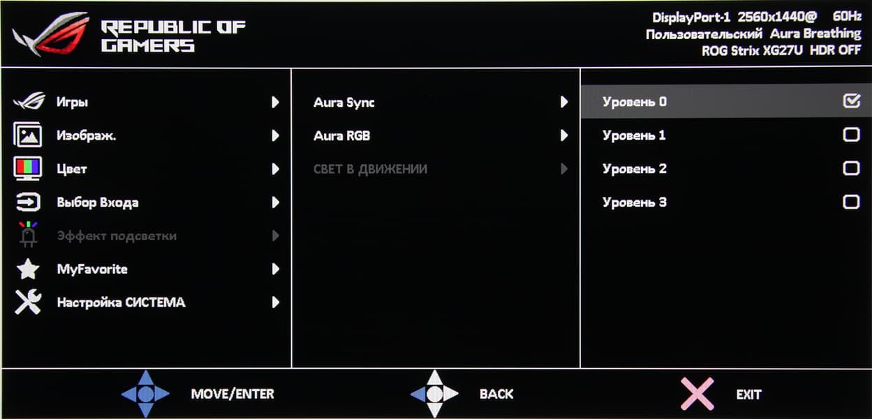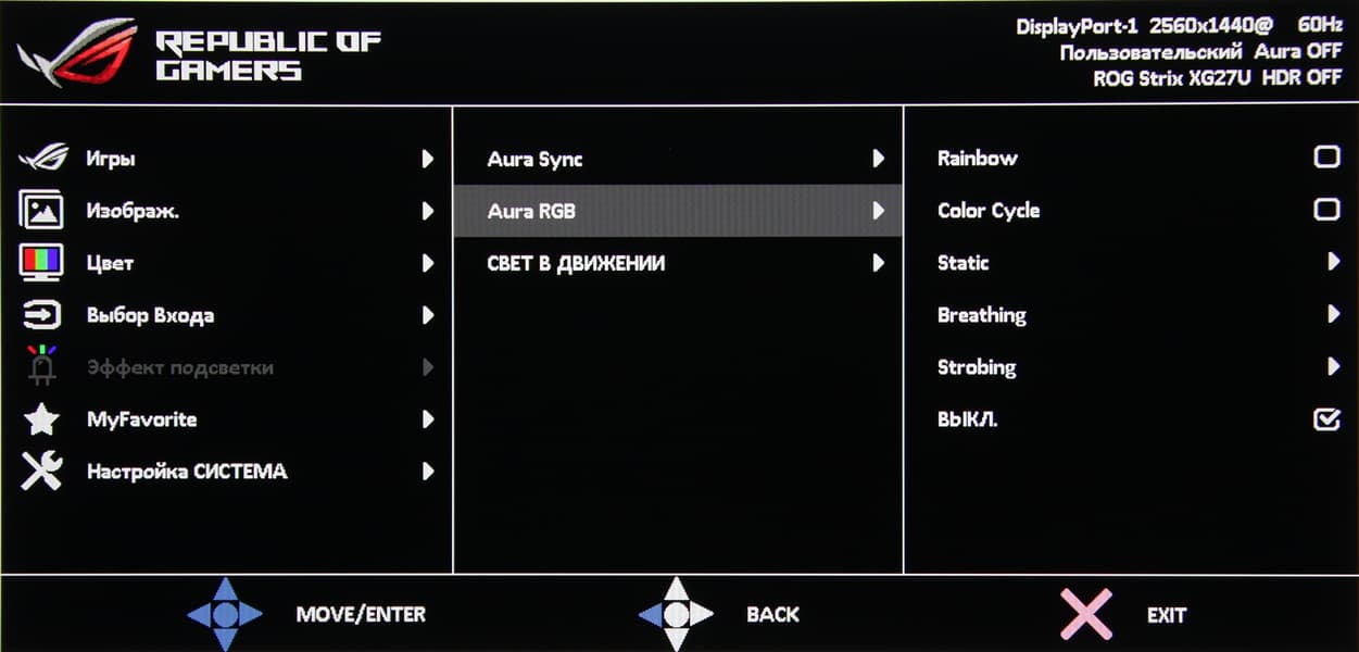 При подключении монитора к компьютеру по USB управлять подсветкой можно с помощью приложения Aura Sync Lighting Control. На практике мы это не проверили, так как это приложение отказалось запускаться на двух из опробованных ПК. Варианты подсветки, которые можно задать с помощью меню монитора, демонстрирует видео ниже: