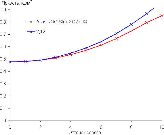 Для оценки характера роста яркости на шкале серого мы измерили яркость 17 оттенков серого при выборе различных значение параметра Гамма: