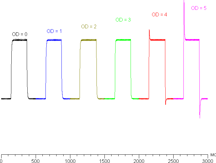 По мере увеличения разгона на графиках некоторых переходов появляются характерные всплески яркости — например, так выглядят графики для перехода между оттенками 40% и 60% (значения OD приведены над графиками):