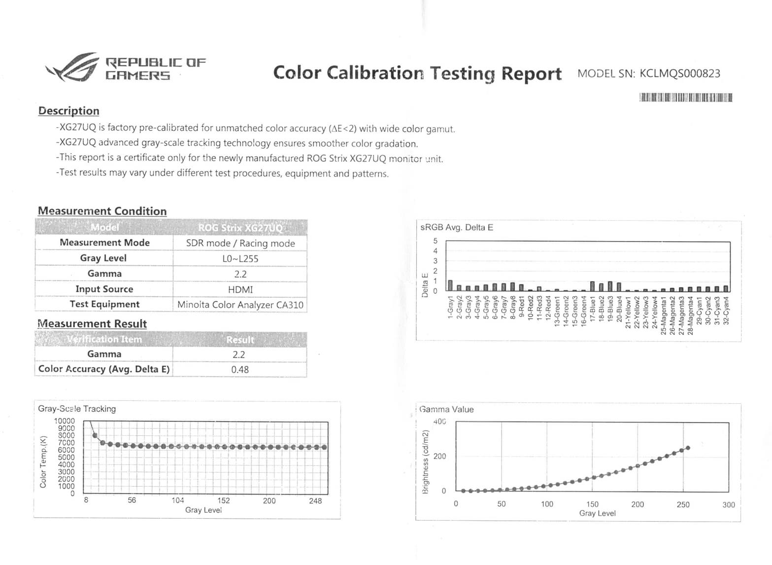 К каждому монитору прилагается отчет о выполненной на заводе калибровке: