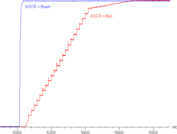 При включении режима ASCR с динамическим управлением яркости на темных сценах яркость подсветки уменьшается, а на черном поле во весь экран подсветка отключается совсем, и белого курсора мыши не достаточно для включения подсветки. При повышении светлоты сцены яркость подсветки повышается. График ниже показывает, как увеличивается яркость (вертикальная ось) при переключении с черного поля (после пяти секунд вывода) на белое при выключенной и включенной динамической подстройке яркости:
