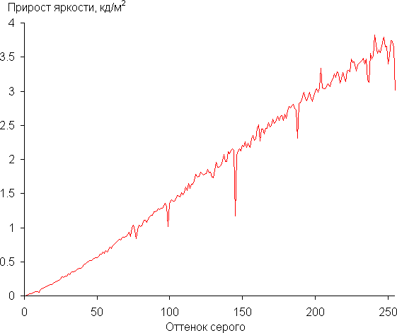 Значения показателей аппроксимирующей функции приведены в скобках в подписях, там же — коэффициент детерминации, чем он выше, тем ближе реальная кривая к степенной функции. Далее мы измерили яркость 256 оттенков серого (от 0, 0, 0 до 255, 255, 255) для случая Гамма = 2.2. График ниже показывает прирост (не абсолютное значение!) яркости между соседними полутонами: