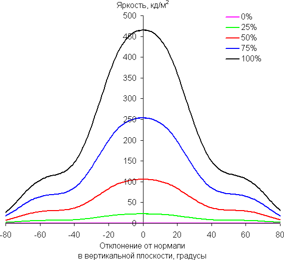 Чтобы выяснить, как меняется яркость экрана при отклонении от перпендикуляра к экрану, мы провели серию измерений яркости черного, белого и оттенков серого в центре экрана в широком диапазоне углов, отклоняя ось датчика в вертикальном, горизонтальном и диагональном направлениях.