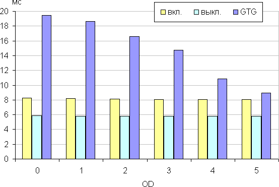 Время отклика зависит от значения настройки OD (видимо, от Over Drive), которая управляет разгоном матрицы. При Уровень 0 разгона нет, при Уровень 5 разгон максимальный. График ниже показывает, как меняется время включения и выключения при переходе черный-белый-черный (столбики «вкл.» и «выкл.»), а также среднее суммарное время для переходов между полутонами (столбики «GTG»):