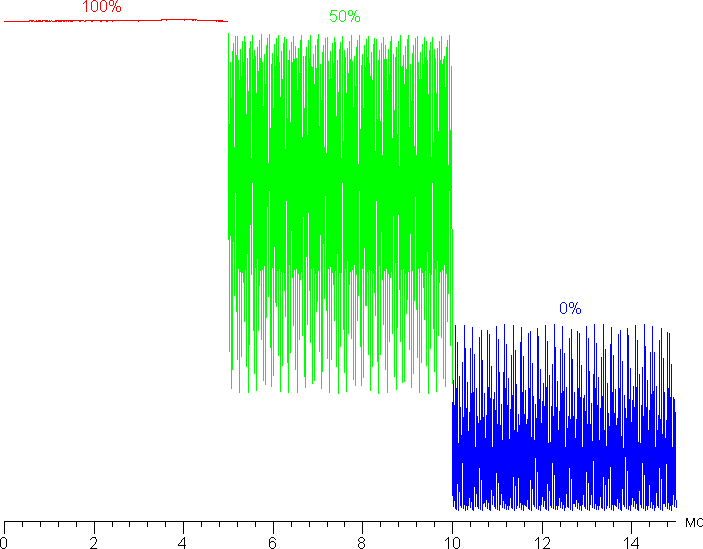 При снижении яркости подсветки появляется модуляция с относительно большой амплитудой, но ее частота очень высокая, порядка 26 кГц, поэтому никакого мерцания не видно и оно не выявляется в тестах на стробоскопический эффект. В доказательство приведем графики зависимости яркости (вертикальная ось) от времени (горизонтальная ось) при различных значениях настройки яркости: