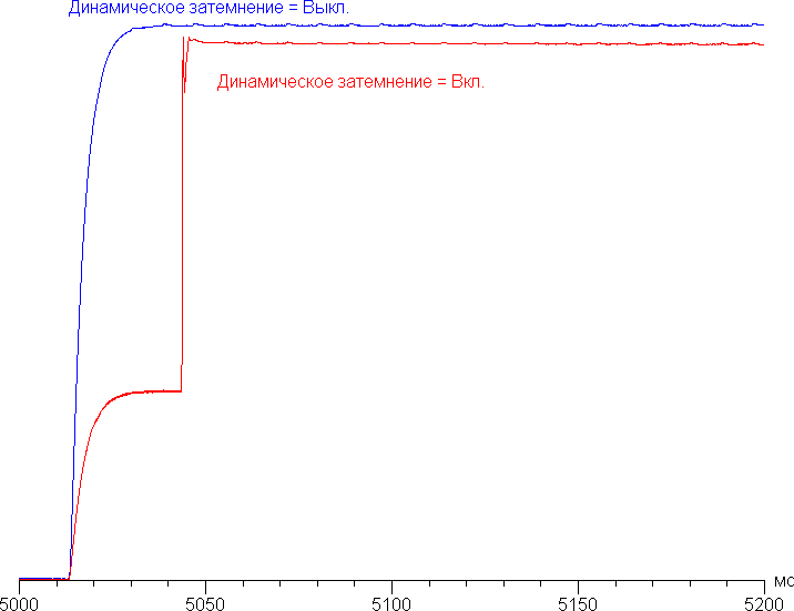 Видно, что в этом режиме яркость подсветки не очень быстро повышается до максимального значения. Особой практической пользы от этой функции нет. Есть еще одна функция, работающая схожим образом — Динамическое затемнение. Если ее включить, то при смене светлоты сцены яркость повышается сразу после небольшой задержки, а на черном поле во весь экран подсветка уже не отключается.