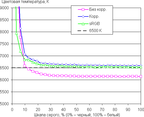 Самый близкий к черному диапазон можно не учитывать, так как в нем цветопередача не так важна, а погрешность измерения цветовых характеристик высокая. Ручная коррекция уменьшила значение ΔE и на белом поле цветовая температуры стала ближе к стандартным 6500 К, но с практической точки зрения и с учетом игрового предназначения монитора особой необходимости в такой коррекции нет. Встроенный профиль sRGB характеризуется достаточно хорошим цветовым балансом, чтобы в большинстве случаев его можно было использовать, например, при просмотре кино.