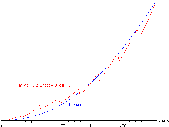 Различимость градаций в тенях можно повысить, увеличив значение настройки Shadow Boost (Уровень1—3). При этом выполняется какое-то динамическое изменение гамма-кривой, что проявляется в виде «пилы» на графике зависимости яркости от оттенка при выводе полей во весь экран: