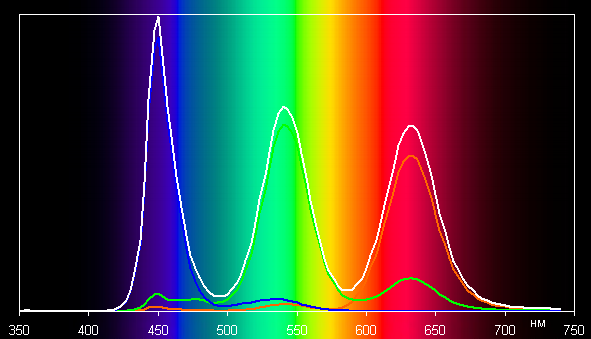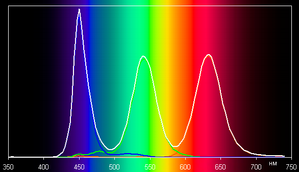 По тому, насколько пики узкие, можно предположить, что в светодиодах подсветки применяется синий, зеленый и красный излучатель.