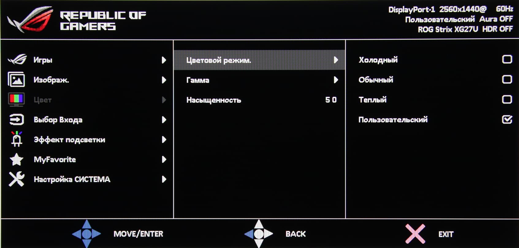 Настроек не очень много, есть регулировки яркости, контрастности и насыщенности, а также выбор цветового профиля из трех предустановленных или пользовательского, в котором цветовой баланс можно подправить регулировками интенсивности трех основных цветов, и профиля гамма-коррекции.