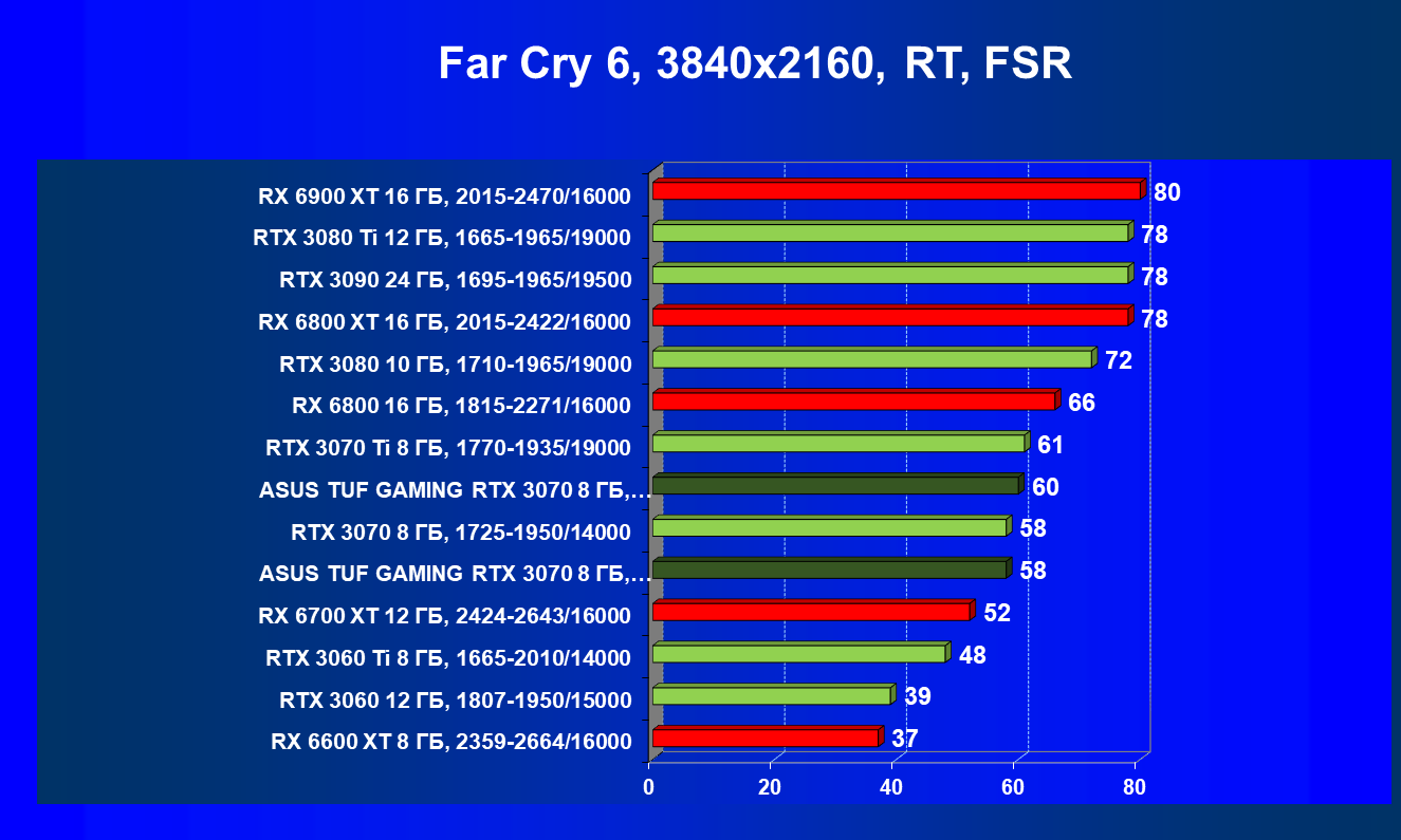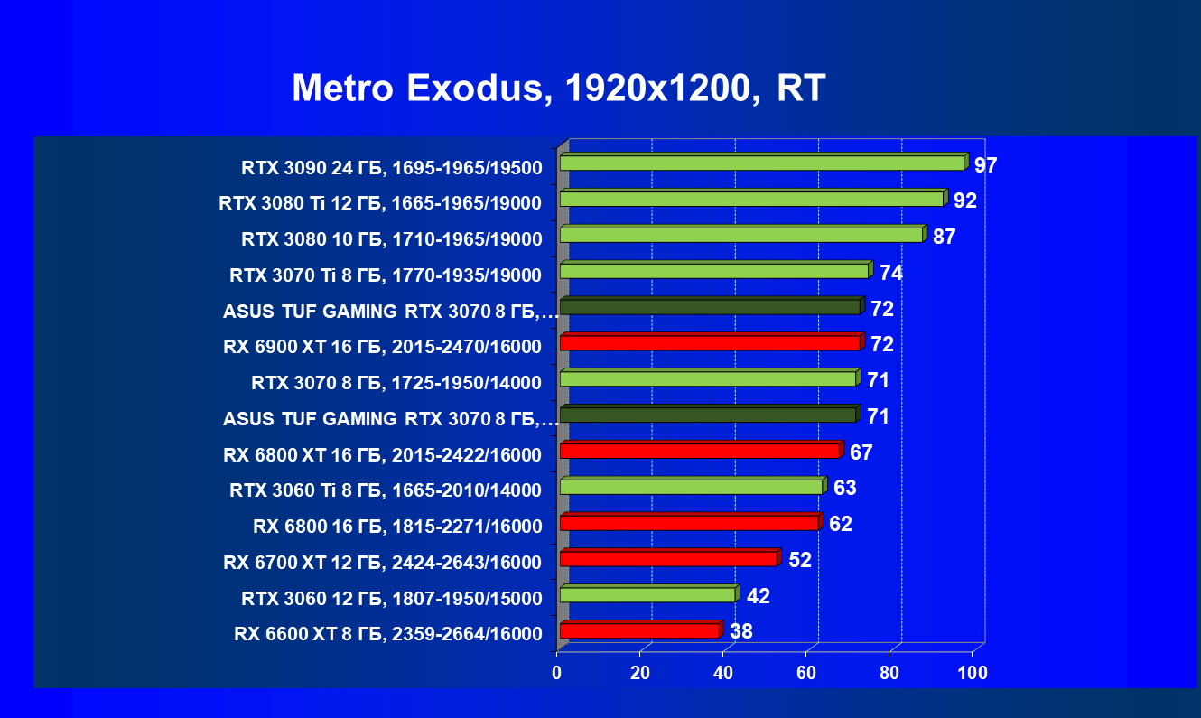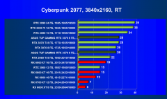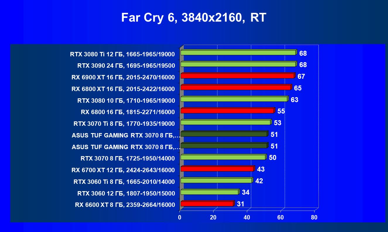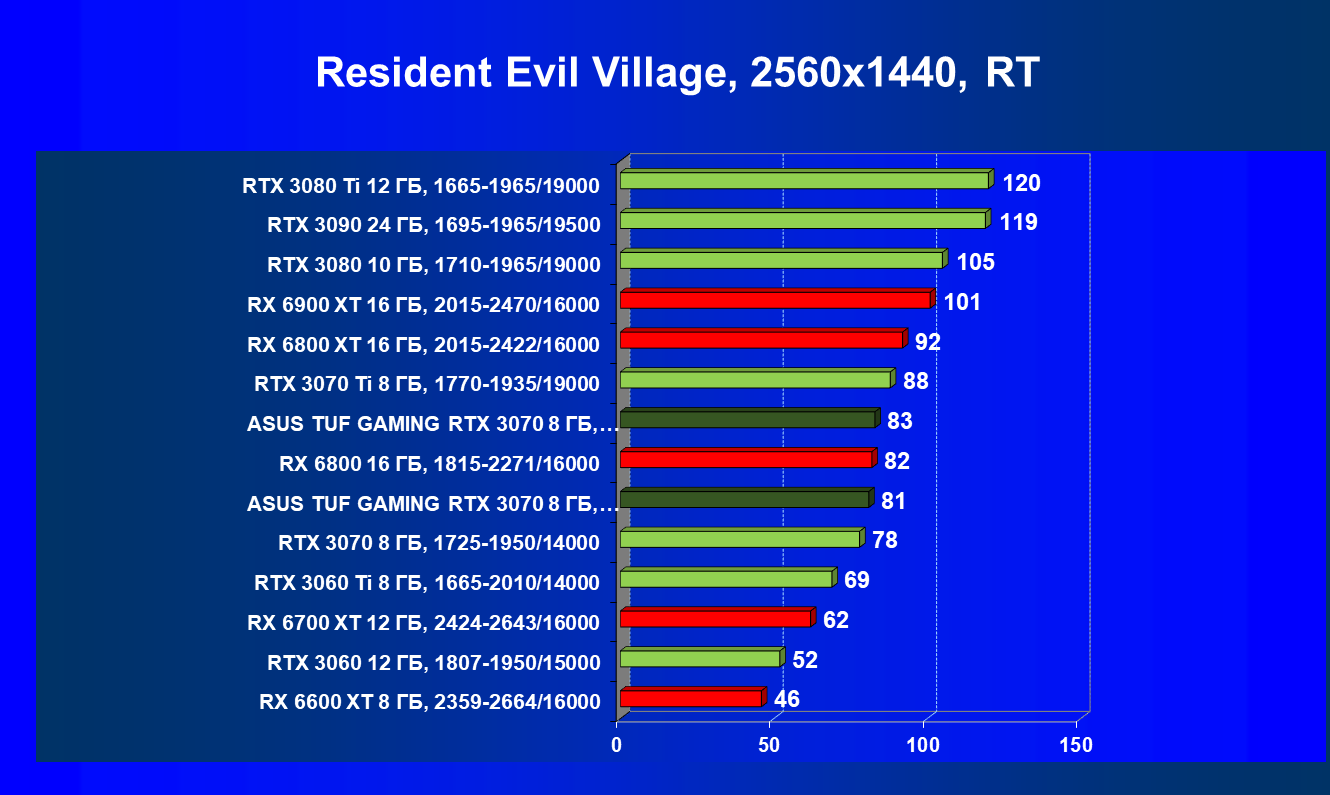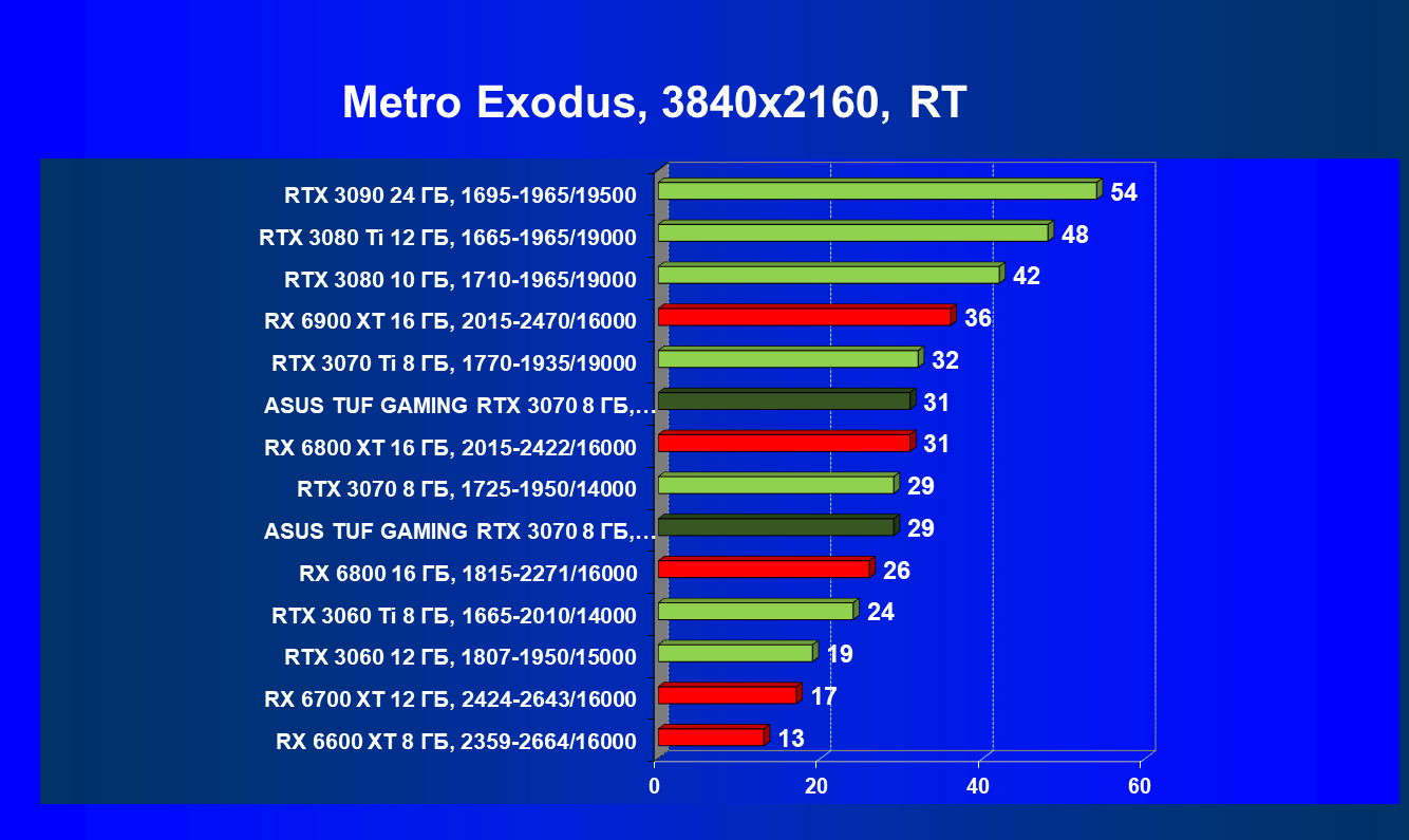 Если задействовать Ray Tracing, уверенно ощущаем преимущество у карты Asus TUF Gaming RTX 3070 по сравнению с вышеупомянутыми «радеонами».