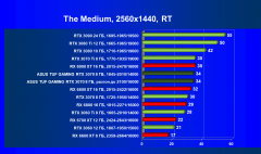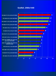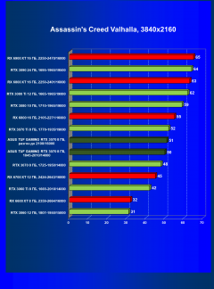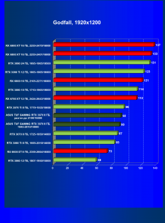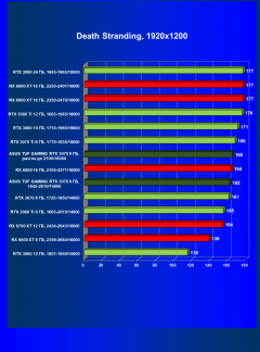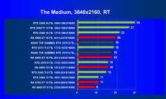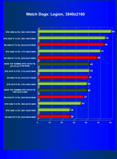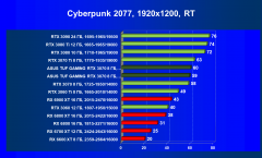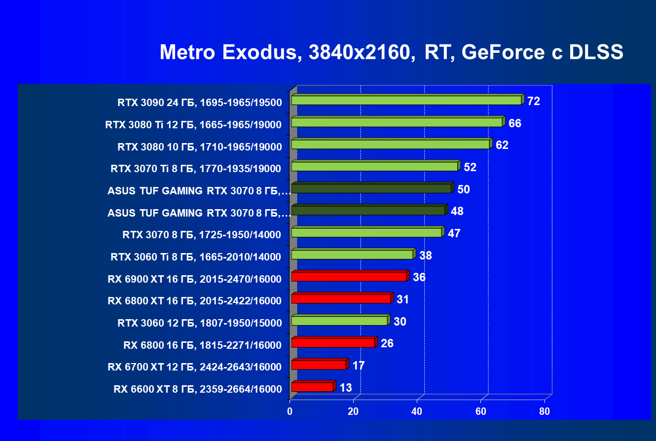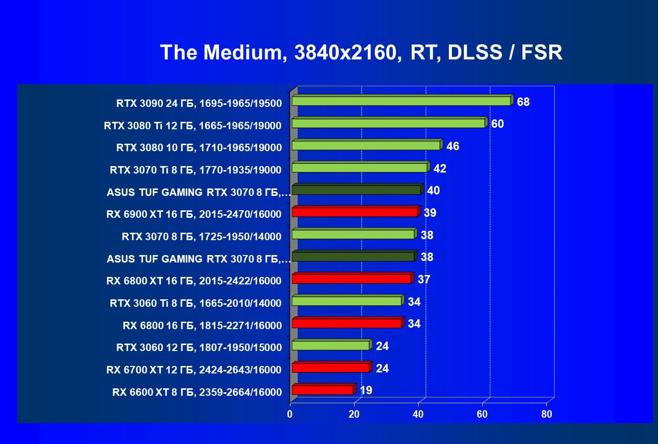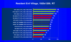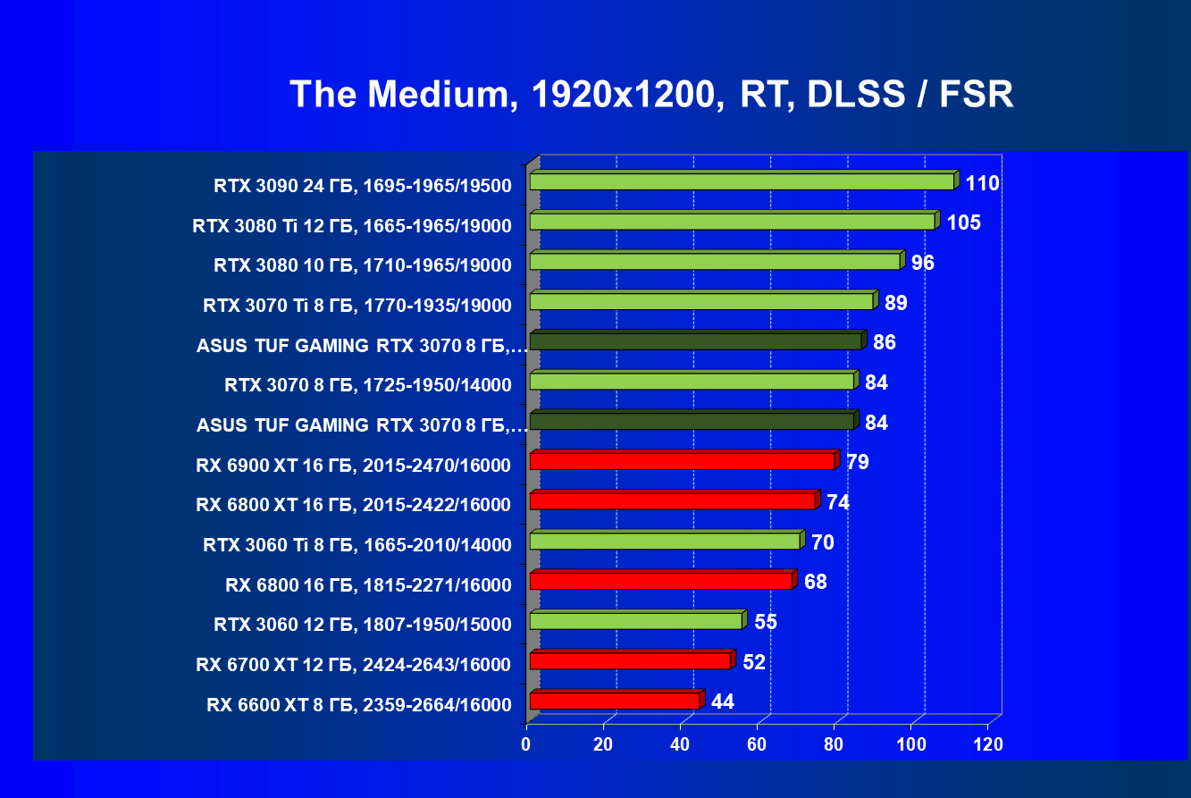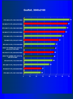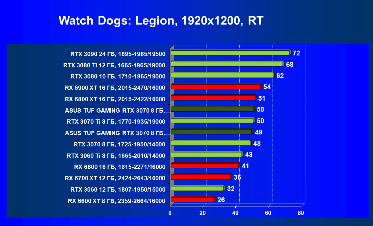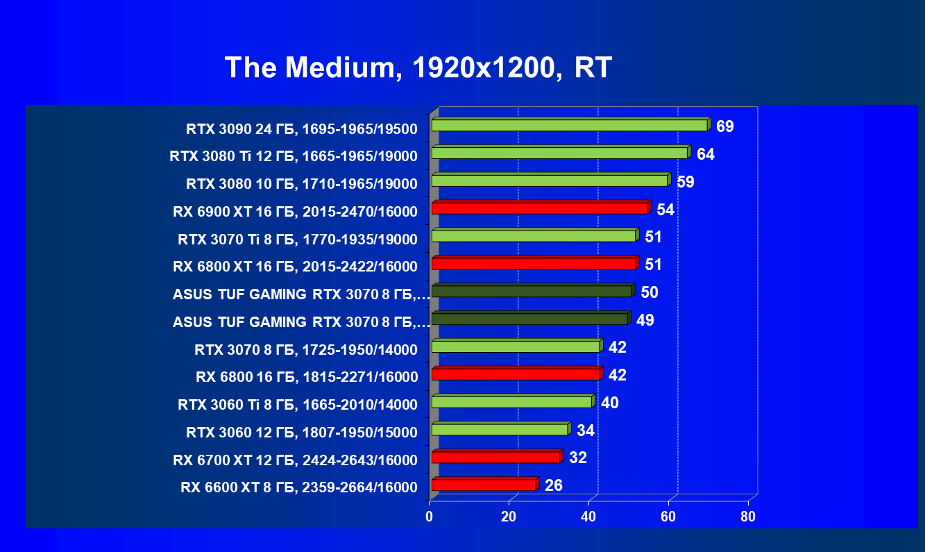 Если задействовать Ray Tracing, уверенно ощущаем преимущество у карты Asus TUF Gaming RTX 3070 по сравнению с вышеупомянутыми «радеонами».