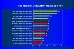 Рейтинг составлен по 8 тестам с применением технологии трассировки лучей (с Nvidia DLSS и с AMD FSR в играх The Medium и Far Cry 6). Этот рейтинг нормирован по самому слабому ускорителю в данной группе — GeForce RTX 3060 (то есть сочетание скорости и функций GeForce RTX 3060 приняты за 100%).