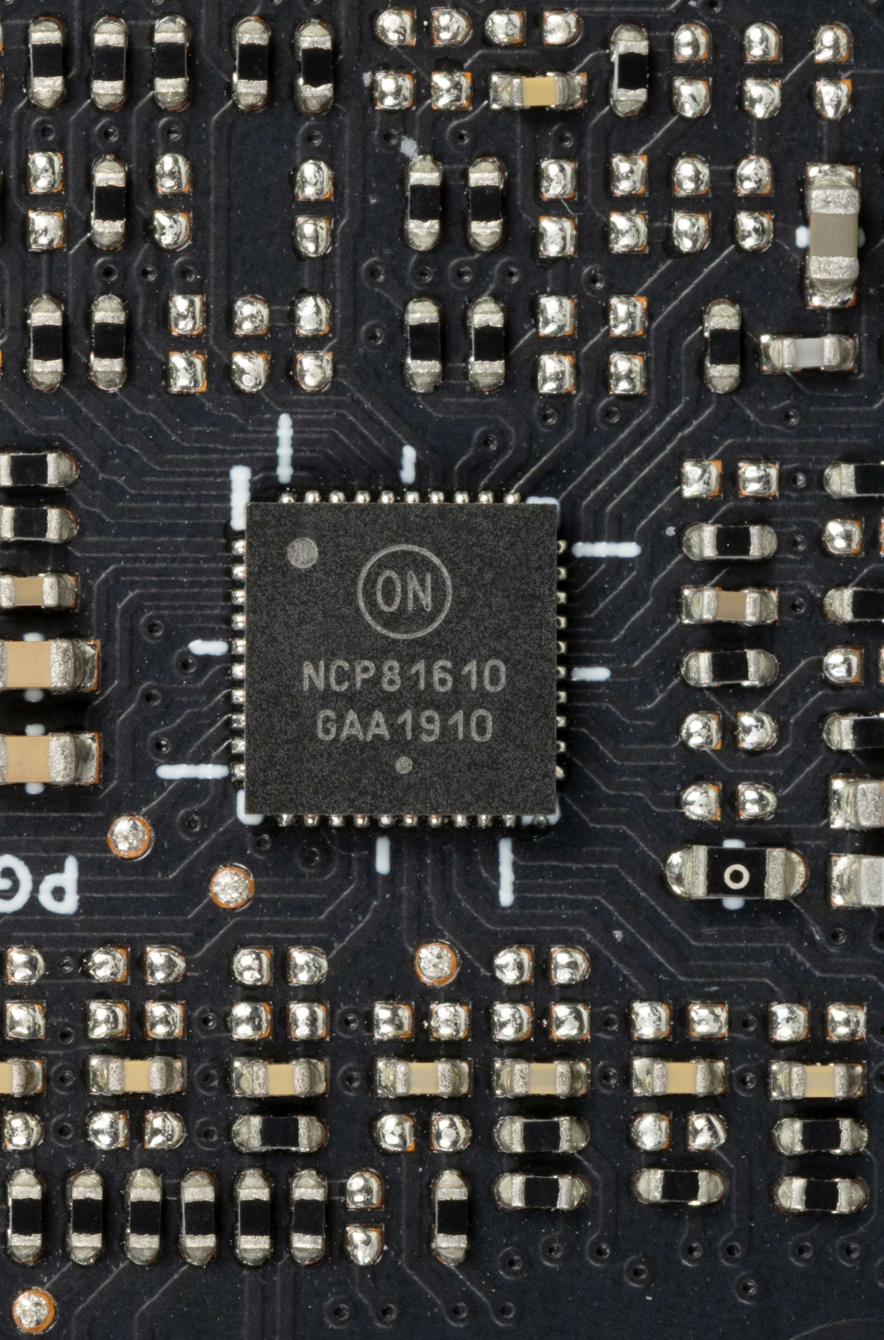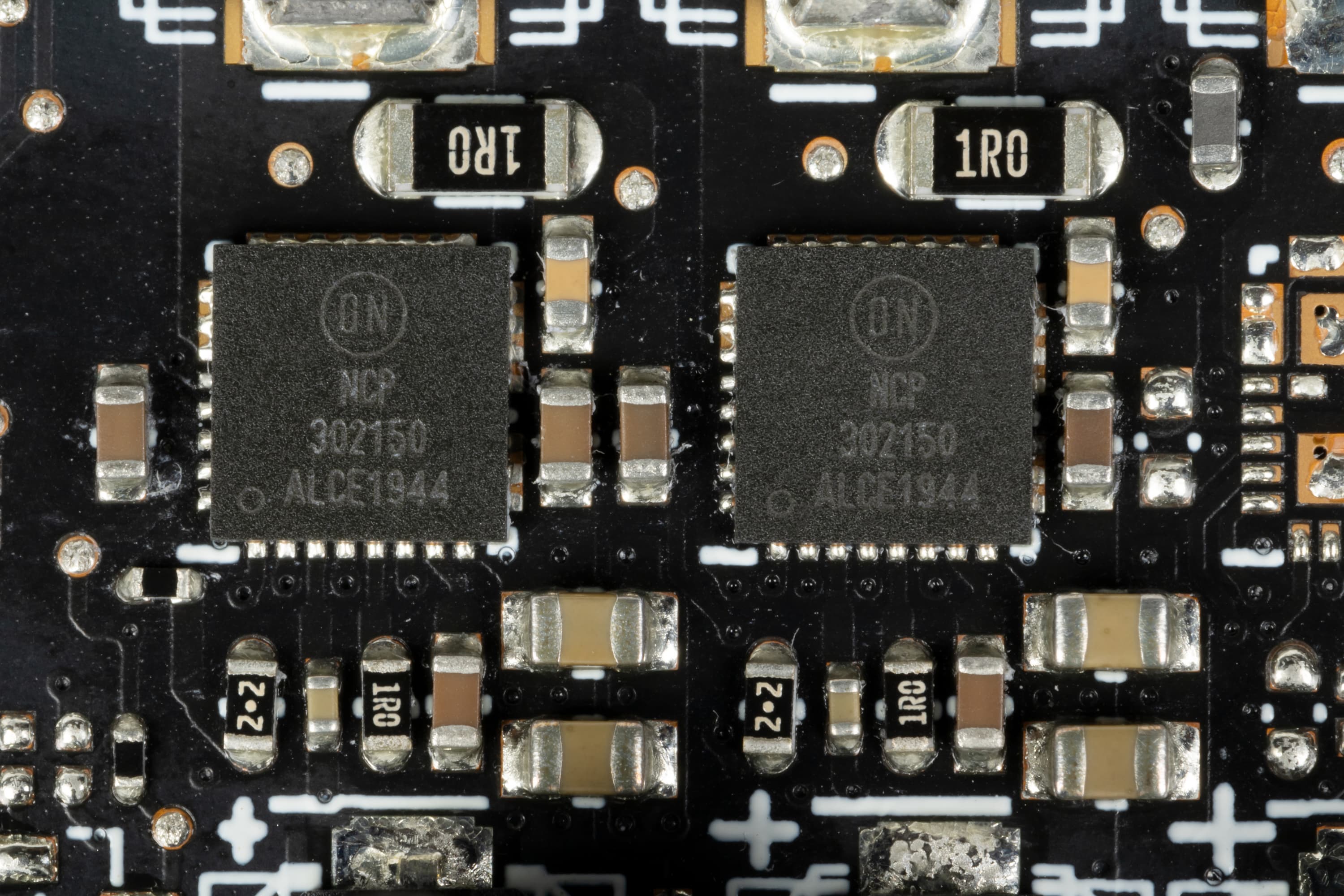 В преобразователе питания используются транзисторные сборки DrMOS — NCP 302150 (On Semiconductor), каждая из которых рассчитана максимум на 50 А.
