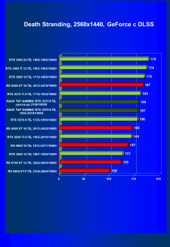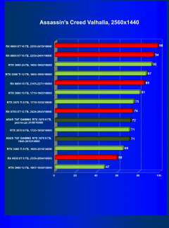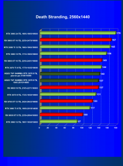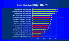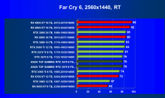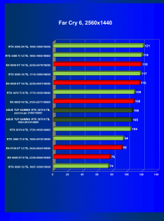 Скорость карты очень хороша для разрешения 2.5K, как с трассировкой так и без нее. Мы видим, что RTX 3070 находится между конкурентами в виде Radeon RX 6700 XT и 6800.
