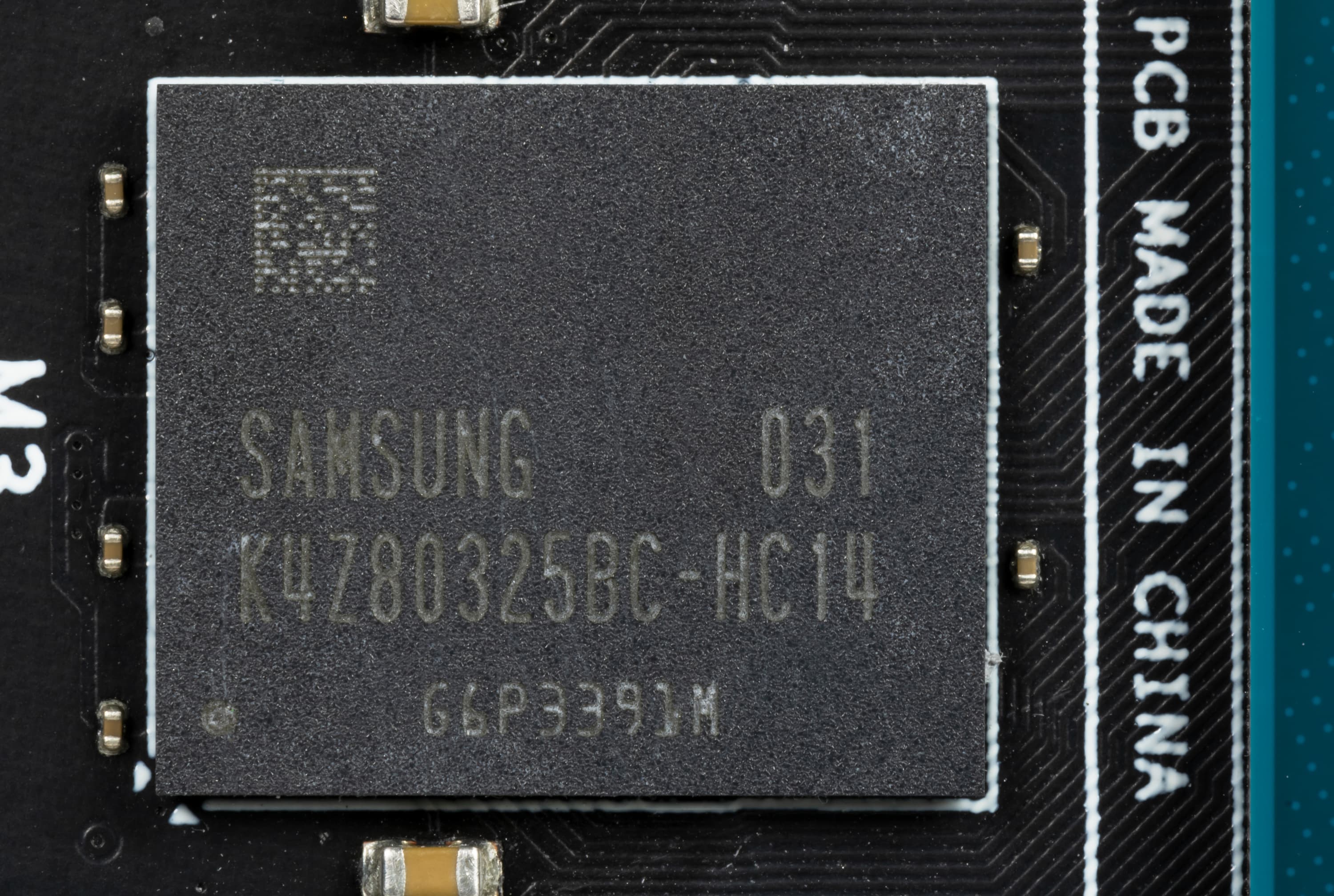 Карта имеет 8 ГБ памяти GDDR6 SDRAM, размещенной в 8 микросхемах по 8 Гбит на лицевой стороне PCB. Микросхемы памяти Samsung (GDDR6, K4Z80325BC-HC14) рассчитаны на условную номинальную частоту работы в 3500 (14000) МГц.