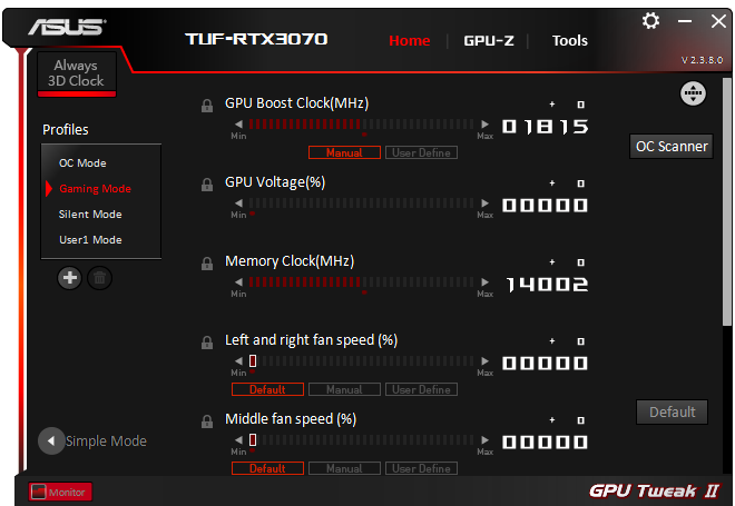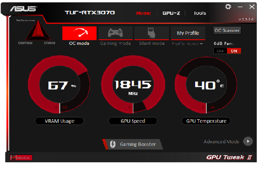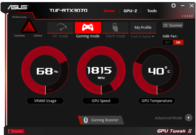 Для выставления OC Mode с сайта Asus следует скачать утилиту Asus GPU Tweak II. Она также позволяет управлять ручным разгоном и наблюдать за мониторингом состояния карты.
