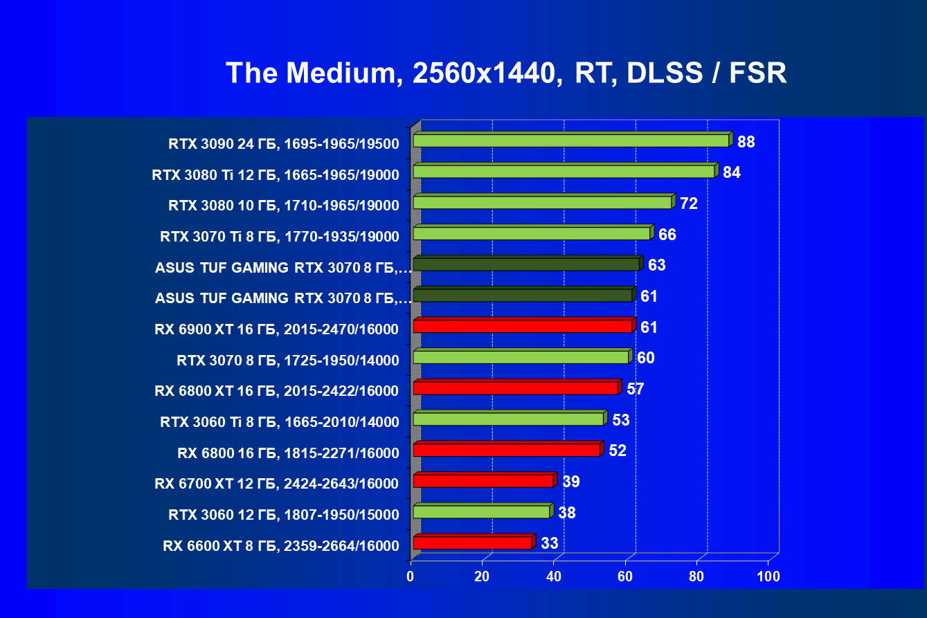 Видеокарты с графическими процессорами Nvidia серии RTX имеют отдельные блоки для расчета трассировки лучей. А использование этой технологии позволяет более чувственно ощутить атмосферу реалистичности в игре за счет отражений от объектов, бликов, пламени и взрывов, что было бы невозможно (или можно, но с огромными дизайнерскими трудозатратами) при использовании только классической растеризации. Отражения также тесно соседствуют с физикой происходящих явлений в игре: свойствами поверхностей, дымностью в джунглях, или, например, проезжающей технике в игре, также мы видим детальную прорисовку на тех же лужах (например, игра The Medium позволяет ощутить всю нагляднj прелесть трассировки лучей). Что касается производительности именно RTX 3070 и карты Asus, то в данном случае уже вряд ли мы сможем получить приемлемый комфорт в 4К, а вот 2.5К — по-прежнему гож.