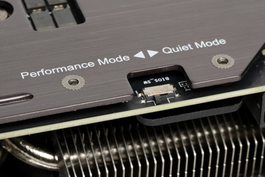 В простое режимы BIOS 1 (Performance) и BIOS2 (Quiet) совершенно не отличались: в 2D температура была не выше 37 °C, вентиляторы — 0 об/мин.