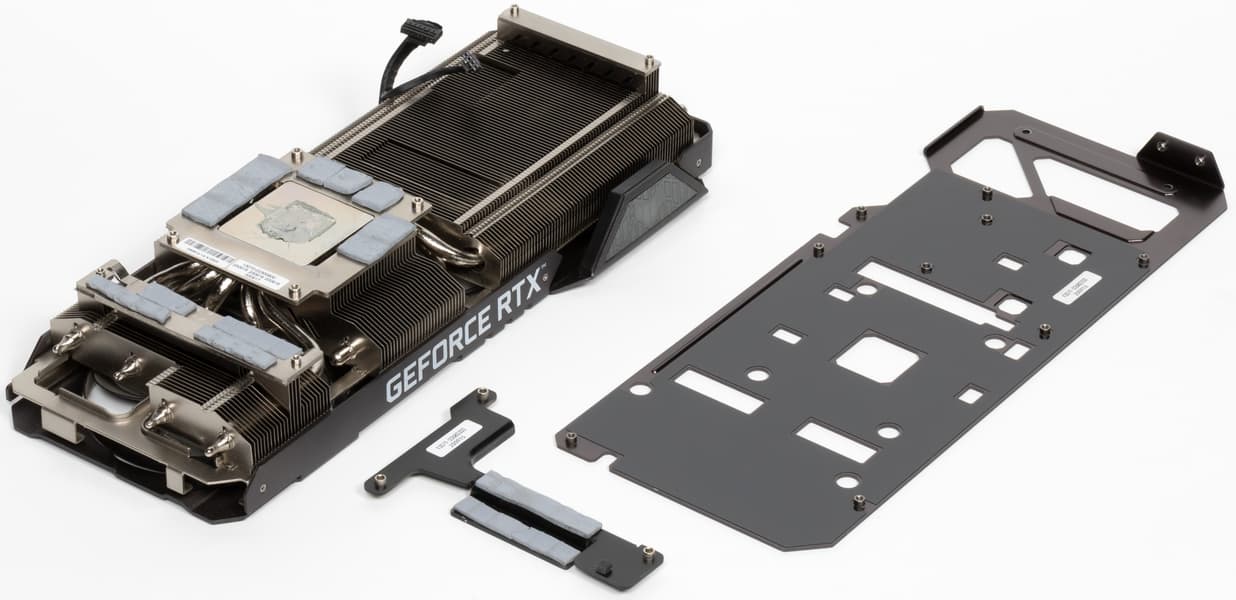 Эта модель GeForce RTX 3070 полна решений, направленных на улучшение электропитания и охлаждения. Под металлическим кожухом работают три мощных вентилятора Axial-tech с долговечными двойными шарикоподшипниками. Как было указано выше, карта занимает почти 3 слота, основой СО является массивный пластинчатый никелированный радиатор из медного сплава, очевидно, что в данной модели с охлаждением графического чипа Nvidia сложностей не будет, а благодаря двойным шарикоподшипникам прослужат дольше, чем вентиляторы с подшипниками других типов. При температуре нагрева графического ядра ниже 55 °C вентиляторы останавливаются, делая видеокарту бесшумной, и ждут момента нагрузки карты для своего уместного запуска.