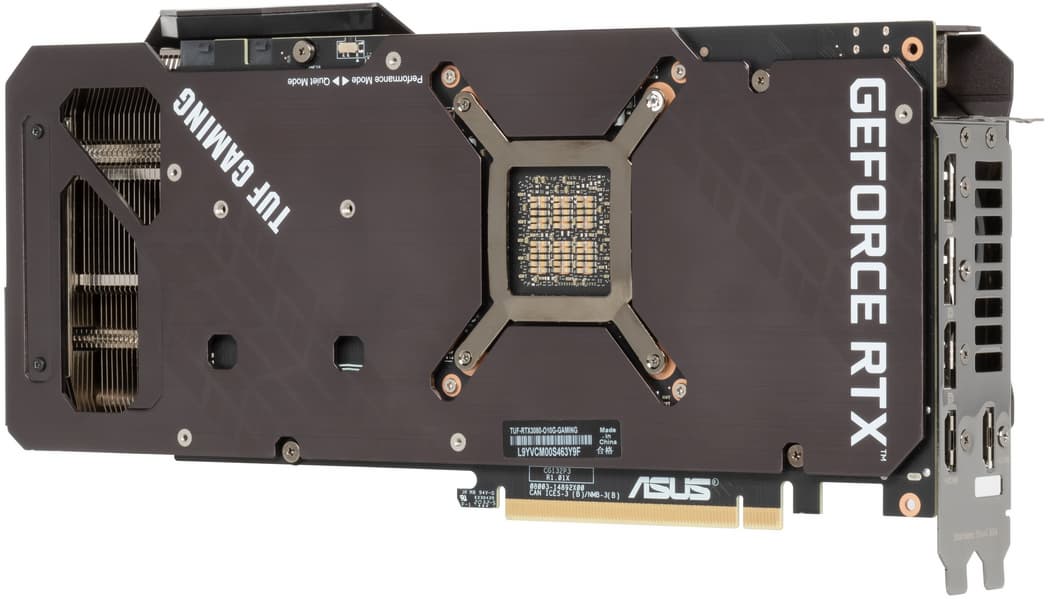 Asus TUF Gaming GeForce RTX 3080 OC Edition (10 ГБ) — интересный представитель одного из мощнейших на сегодня 3D-ускорителей, имеющий строгий дизайн (подойдет для ненавистников вычурного дизайна с обилием подсветки), а также очень эффективный кулер, который и охлаждает очень хорошо, и достаточно тихий. Карта предлагает два режима работы СО (Performance и Quiet), и во втором работает тихо. Еще из особенностей отметим наличие пяти видеовыходов: к обычному набору из трех DP 1.4a и одного HDMI 2.1 добавился второй HDMI 2.1 (однако все равно одновременно можно выводить картинку только на 4 приемника). Также нет нужды беспокоиться о возможном перекосе достаточно тяжелой карты в корпусе: плата сама по себе имеет весьма жесткую конструкцию.