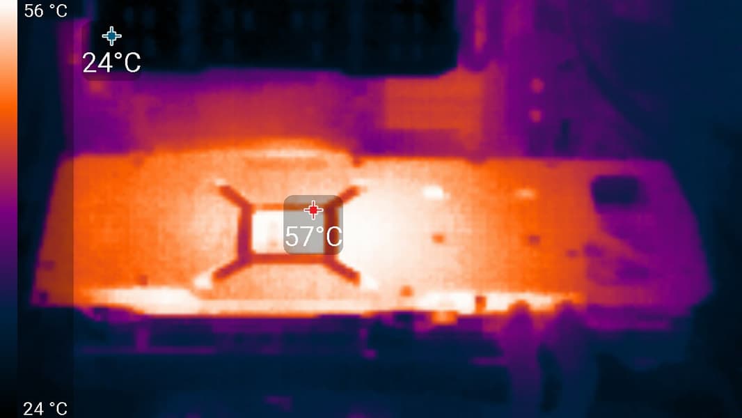 Максимальный нагрев наблюдался в центральной части PCB, в основном около ядра (а микросхемы памяти GDDR6X оказались самыми нагревающимися элементами).