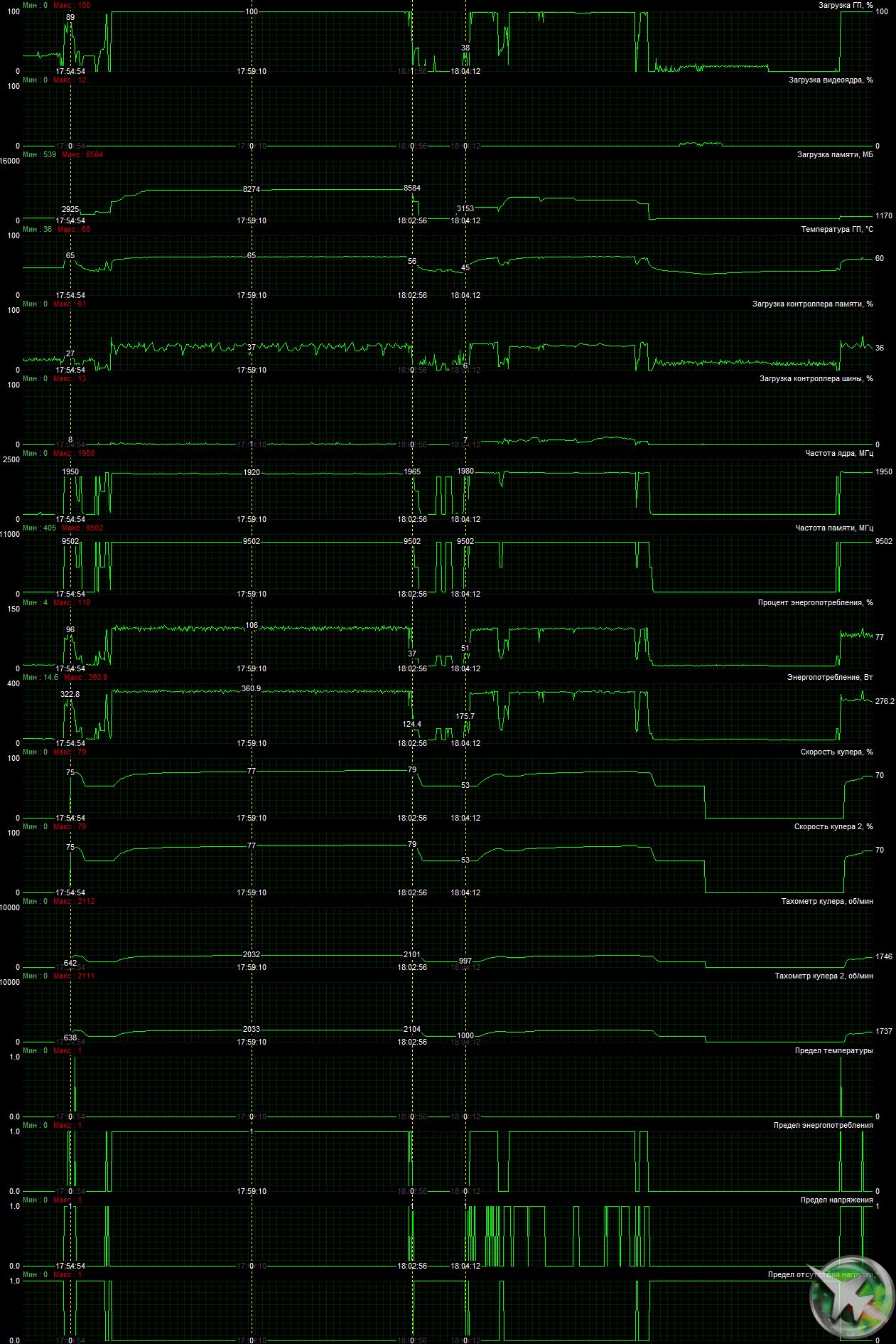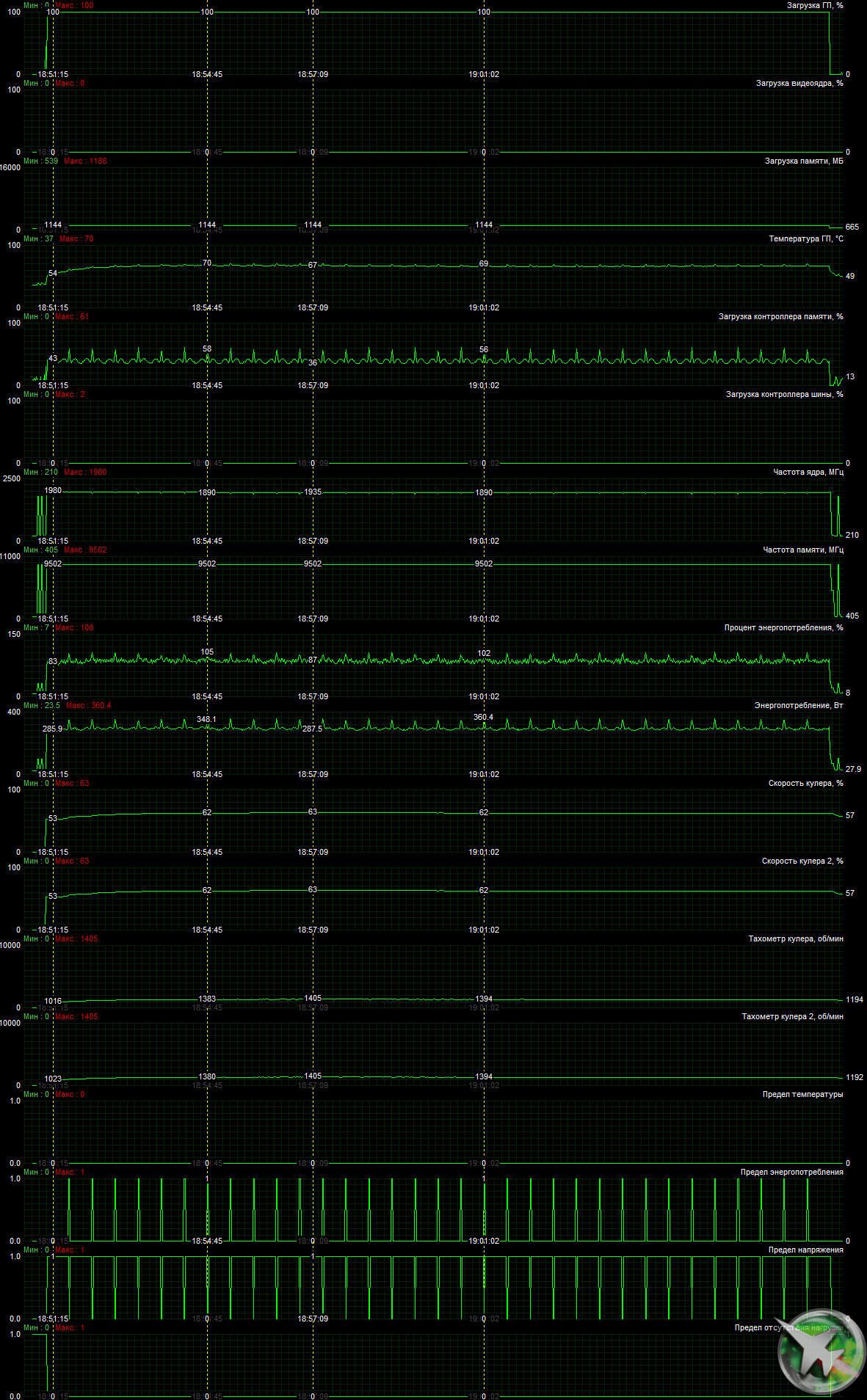 После 6-часового прогона под нагрузкой в режиме Performance максимальная температура ядра не превысила 65 градусов, что является просто отличным результатом для видеокарт флагманского уровня. Энергопотребление карты доходило почти до 360 Вт.