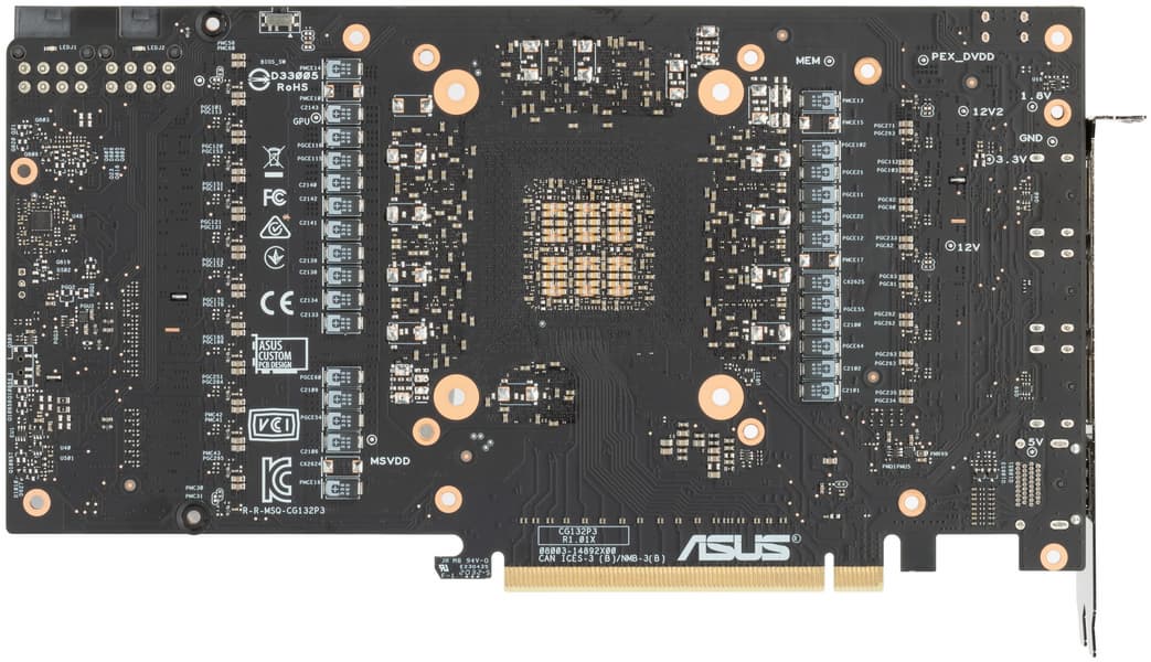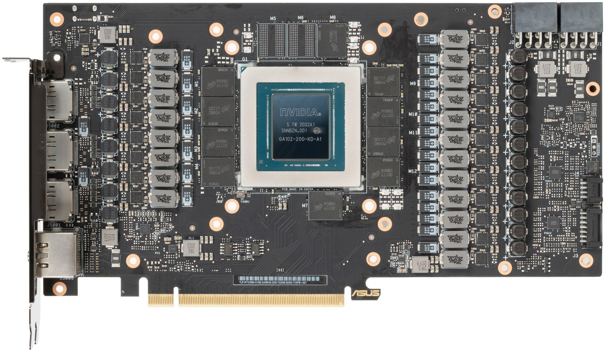 Карта Asus получилась более габаритной, чем Founders Edition, но она все-таки существенно короче своей системы охлаждения. Суммарное количество фаз питания у референс-карты и у карты Asus одинаковое — 20; то же справедливо и в отношении распределения фаз — по 16 фаз на ядро и по 4 на микросхемы памяти.