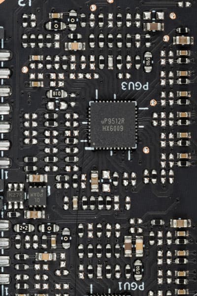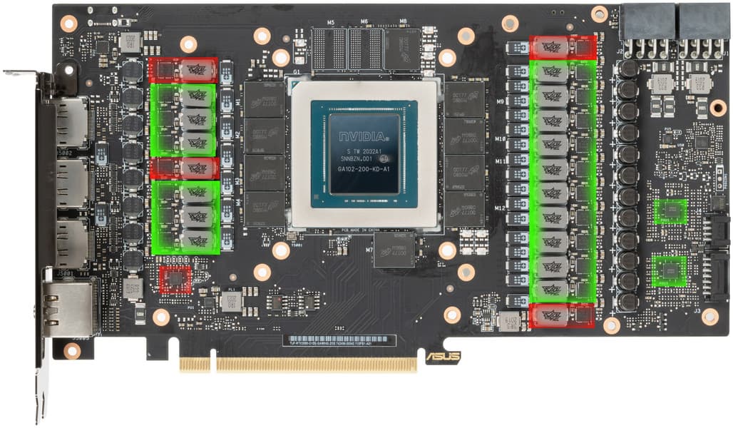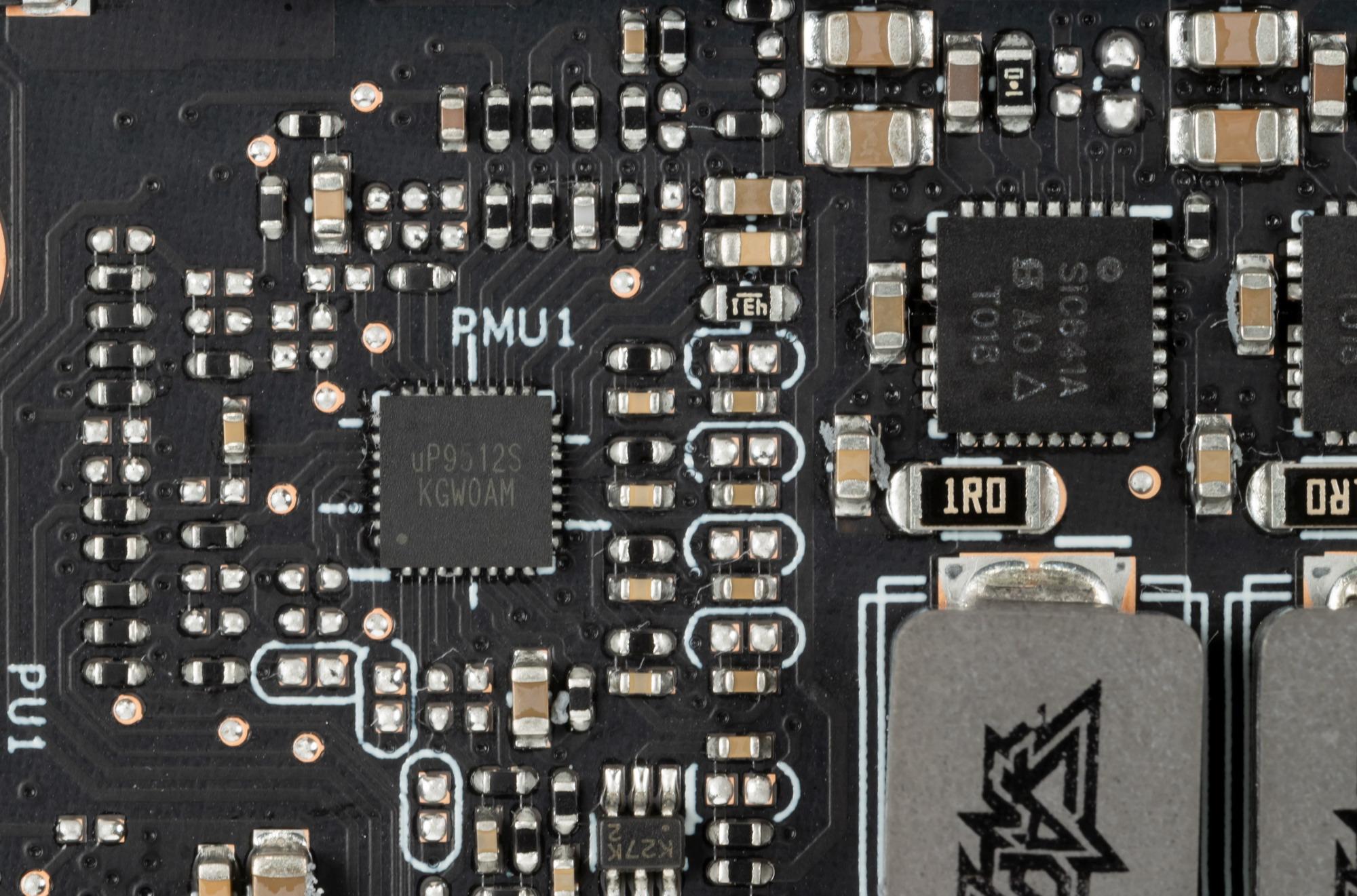 Зеленым цветом отмечена схема питания ядра, красным — памяти. При этом никаких удвоителей (даблеров) фаз нет, для управления схемой питания GPU используются два ШИМ-контроллера uP9512R (uPI Semiconductor), каждый из которых способен управлять 8 фазами максимум. Оба расположены на лицевой стороне платы.