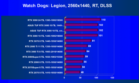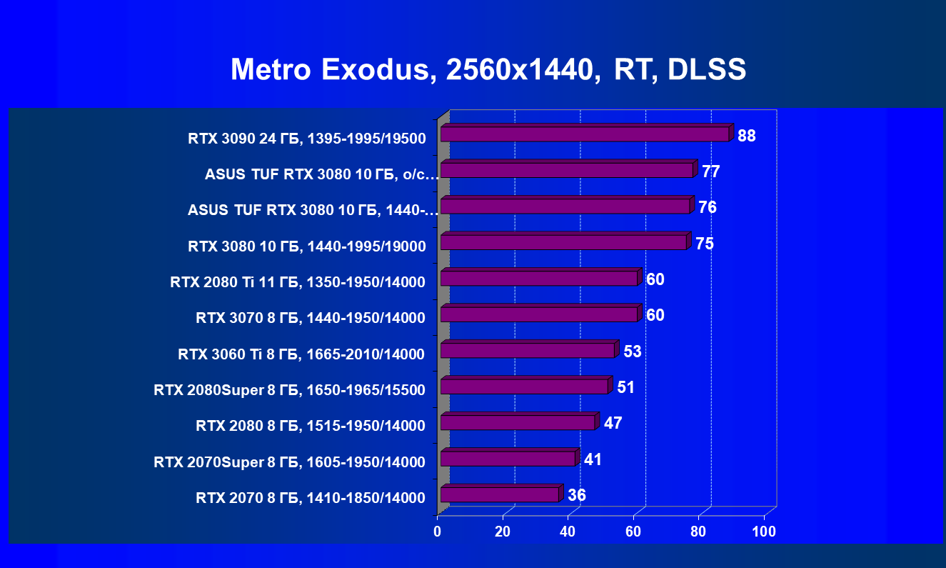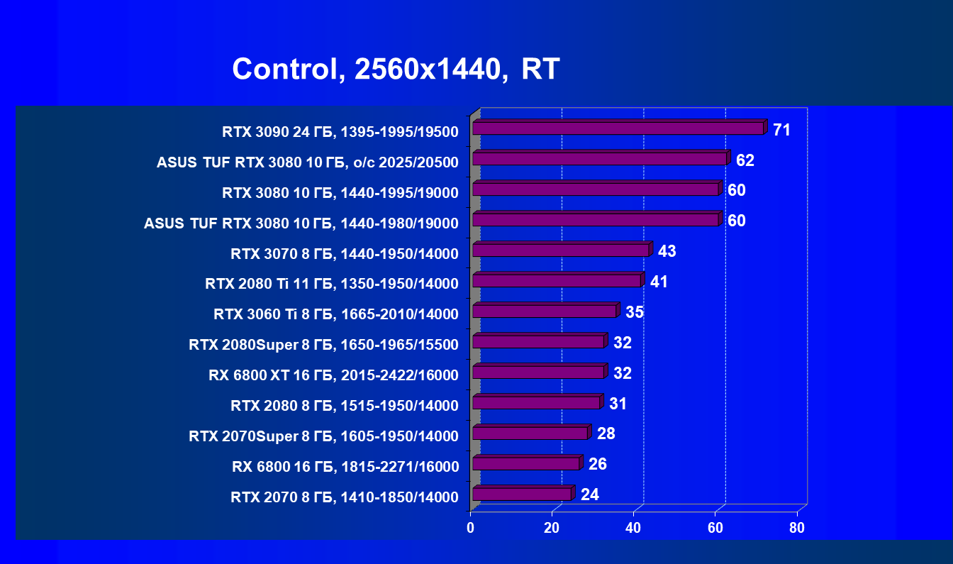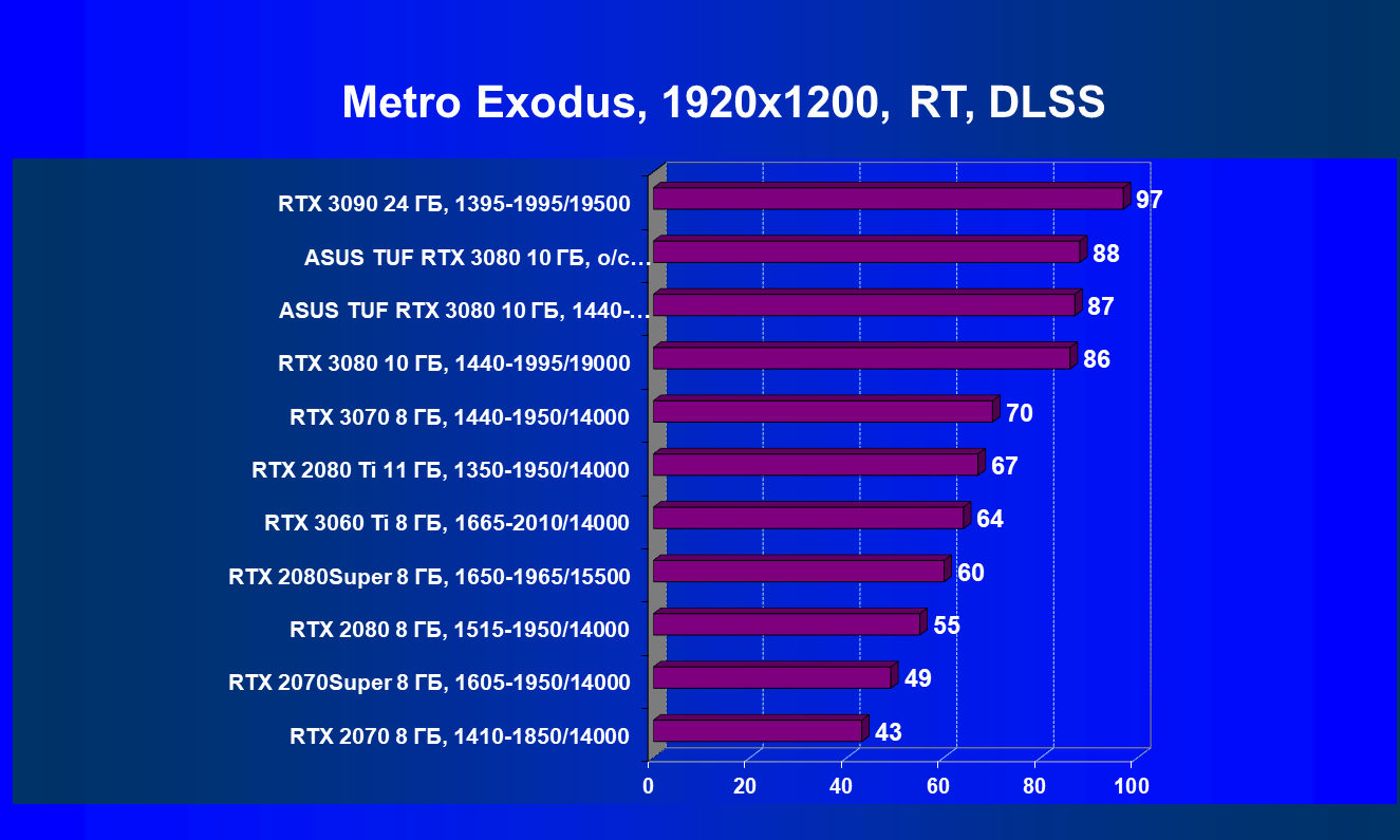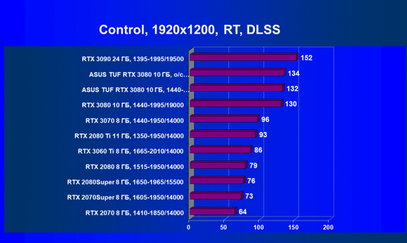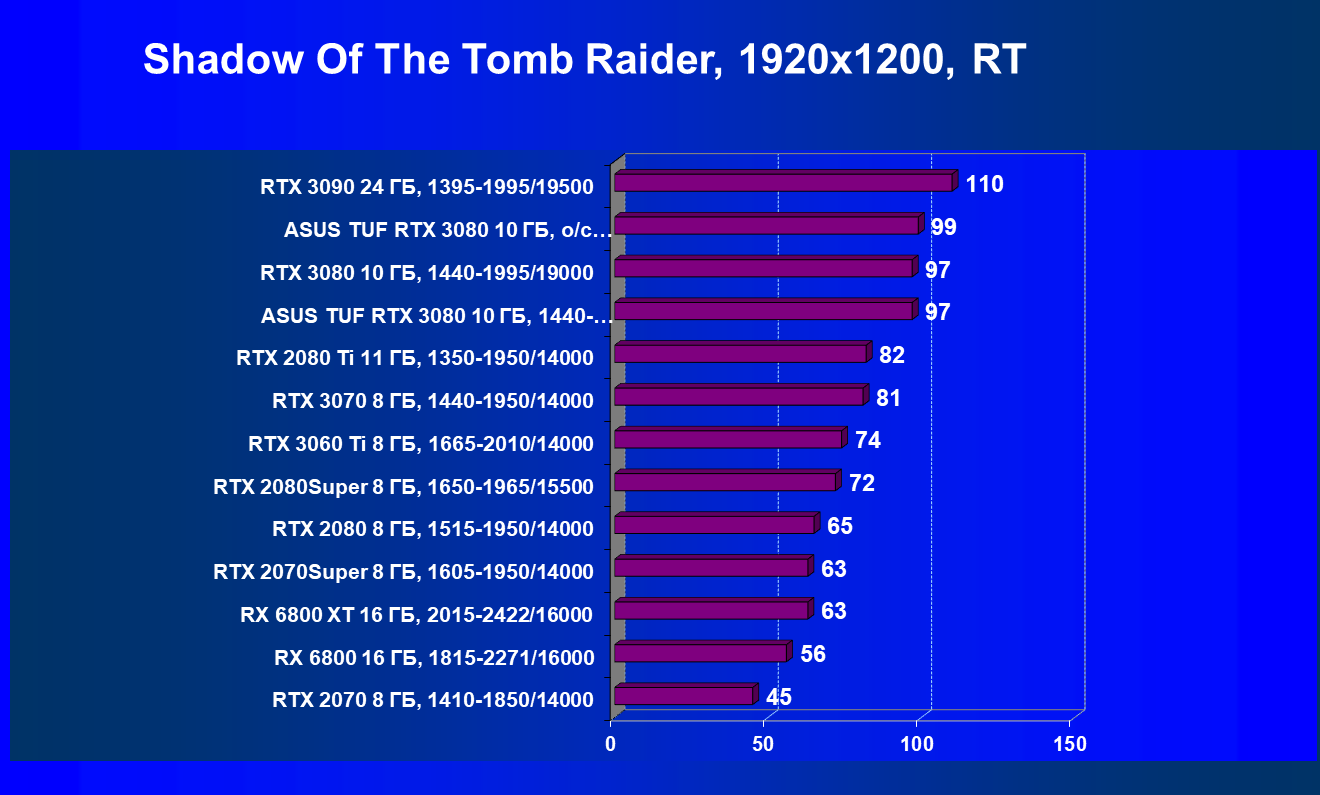 | 09 | Asus TUF RTX 3080 10 ГБ, разгон до 2025/20500 | 182 | 1805 | 99 000 |