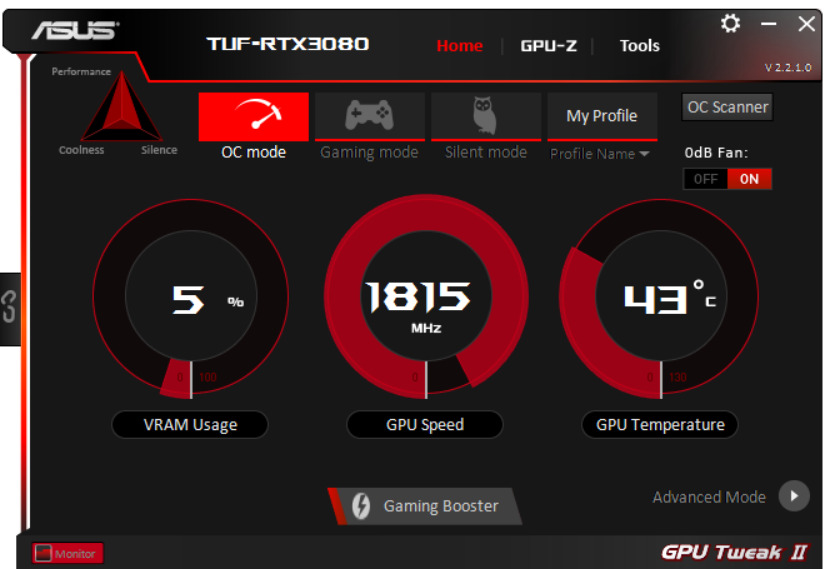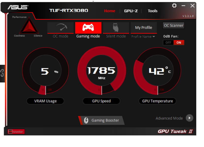Штатная частота памяти у карты Asus равна референсному значению, а частота работы ядра в режиме по умолчанию (Gaming mode) прилично выше в бусте (на 4,4%), однако максимальная частота — на уровне референсного максимума, поэтому суммарно производительность выросла всего на один процент. OC Mode поднимает частоту в Boost на 6,6% относительно референсной величины, однако максимальная частота лишь чуть выше референсной, поэтому суммарно прирост производительности оказался не выше 2%. При ручном разгоне потребление можно поднять лишь до 110%, так что, скорее всего, драйверы ограничат разгон привычными 3%-5% прироста производительности вне зависимости от установки частот. Я попытался выставить +115 МГц по ядру и +750 МГц по памяти, что дало максимальные частоты в 2025/20500 МГц, это на 2,5% выше референсных величин. В общем, разгон сильно лимитирован потреблением и драйверами.