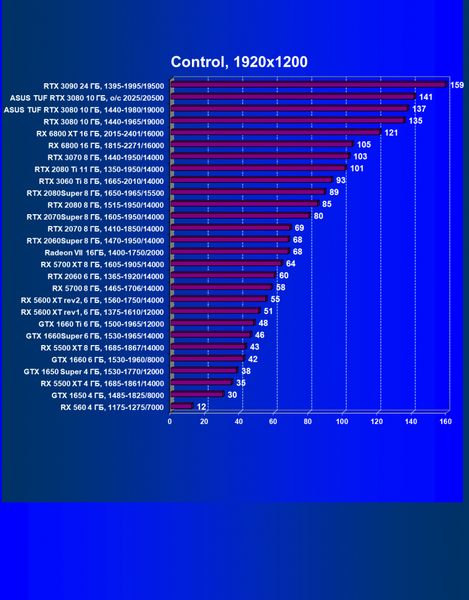 Рейтинг составлен по всем тестам без использования технологий трассировки лучей. Этот рейтинг нормирован по самому слабому ускорителю — Radeon RX 560 (то есть сочетание скорости и функций Radeon RX 560 приняты за 100%). Рейтинги ведутся по 28 ежемесячно исследуемым нами акселераторам в рамках проекта Лучшая видеокарта месяца. В данном случае из общего списка выбрана группа карт для анализа, в которую входят GeForce RTX 3080 и его конкуренты.