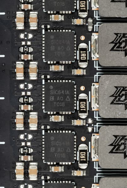 Схема питания ядра у карты Asus традиционно построена с применением технологии Super Alloy Power II, использованы современные твердотельные конденсаторы и транзисторные сборки DrMOS — в данном случае SiC641A (Vishay Siliconix), каждая из которых рассчитана максимально на 50 А.