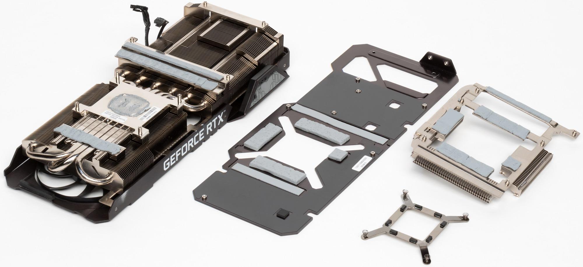 Основой СО является огромный двухсекционный пластинчатый никелированный радиатор с тепловыми трубками, припаянными к подошве прямого контакта с GPU. Этот же радиатор служит охладителем и для компонентов преобразователей питания VRM с помощью небольших подошв. Для микросхем памяти на лицевой стороне PCB, а также для остальных мосфетов VRM предусмотрен отдельный радиатор, прикручивающийся к основному. Задняя пластина выполнена из алюминия с электрозащитным покрытием и имеет тройное предназначение: служит элементом защиты PCB; через термоинтерфейс участвует в охлаждении PCB в районе микросхем памяти и преобразователей питания; ну и еще является ребром жесткости всей карты, будучи жестко прикрученной к крепежной планке (костылю). Из-за возросшей площади кристалла GPU в картах стали применять «четырехлапый» амортизатор, который помогает равномерно распределять прижим подошвы радиатора по всей площади кристалла.