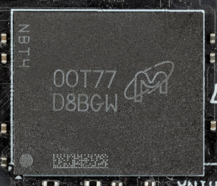 Карта имеет 10 ГБ памяти GDDR6X SDRAM, размещенной в 10 микросхемах по 8 Гбит на лицевой стороне PCB. Микросхемы памяти Micron (GDDR6X, MT61K256M32JE-19) рассчитаны на условную номинальную частоту работы в 4750 (19000) МГц. Расшифровщик кодов на упаковках FBGA находится здесь.