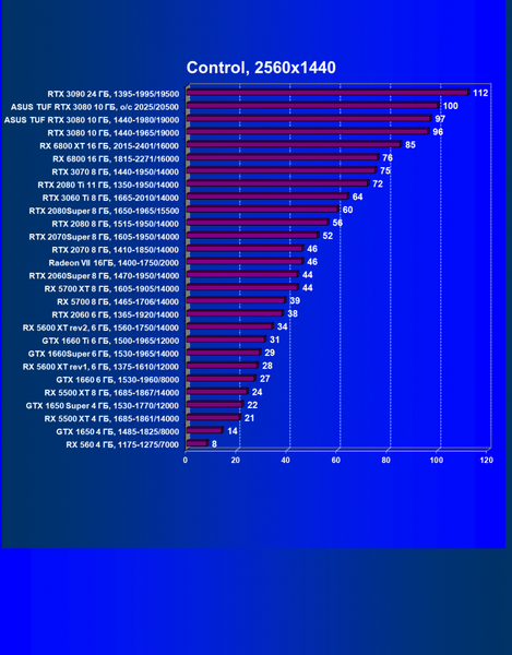 Рейтинг составлен по всем тестам без использования технологий трассировки лучей. Этот рейтинг нормирован по самому слабому ускорителю — Radeon RX 560 (то есть сочетание скорости и функций Radeon RX 560 приняты за 100%). В данном случае из общего списка выбрана группа карт для анализа, в которую входят GeForce RTX 3080 и его конкуренты.