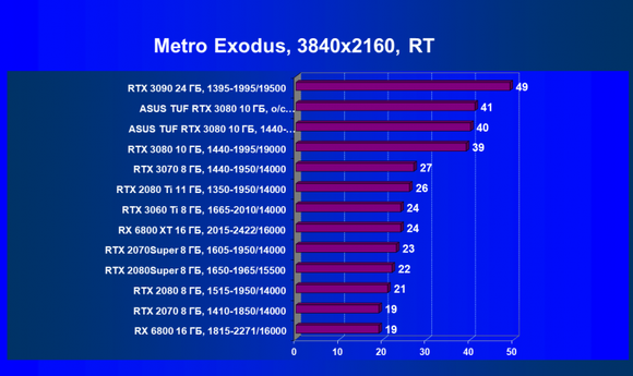Если взять чистую производительность в играх без использования трассировки лучей и иных «умных» проприетарных технологий, то Radeon RX 6800 XT и GeForce RTX 3080 идут ноздря в ноздрю, выдавая практически одинаковую производительность в играх. Карта Asus чуть вырвалась вперед исключительно за счет небольшого фабричного разгона.