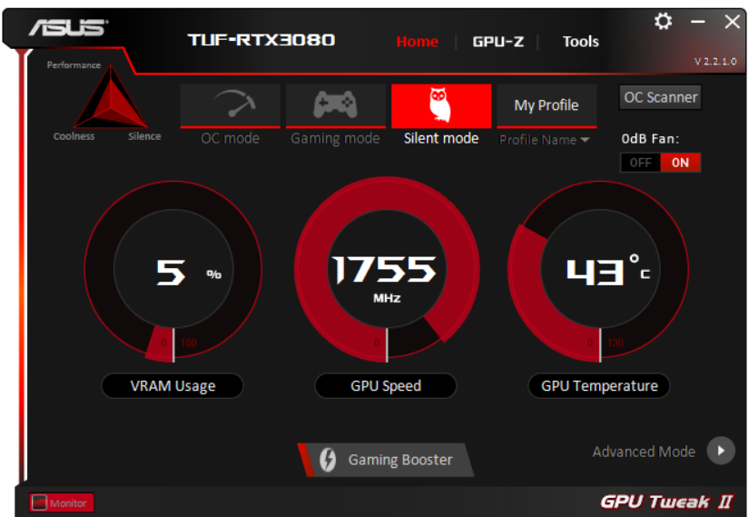 В простое режимы Performance Mode и Quiet Mode совершенно не отличались: в 2D температура была не выше 43 °C, вентиляторы не работали, уровень шума был равен фоновому — 18 дБА.
