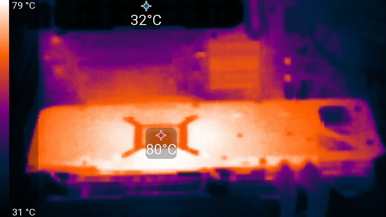 Максимальный нагрев наблюдался в центральной части PCB, в основном около ядра (а микросхемы памяти GDDR6X оказались самыми нагревающимися элементами).
