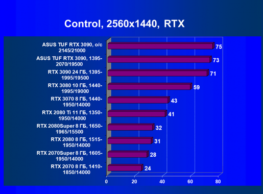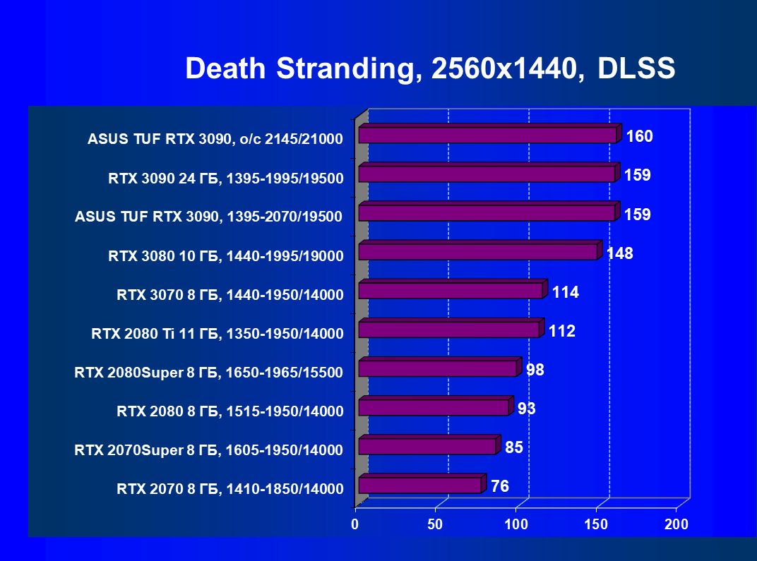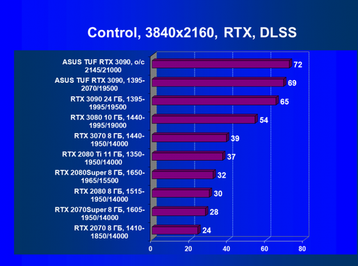 Стоит снова повторить, что наличие большого объема памяти и прекрасная производительность дает GeForce RTX 3090 право называться первым видеоускорителем игрового класса для разрешения 8К. Игры должны поддерживать умный антиалиасинг DLSS 2.0 (причем именно для разрешения 4К и выше), тогда комфорт при игре на огромных 8К-телевизорах будет обеспечен при сохранении всех настроек графики по максимуму.