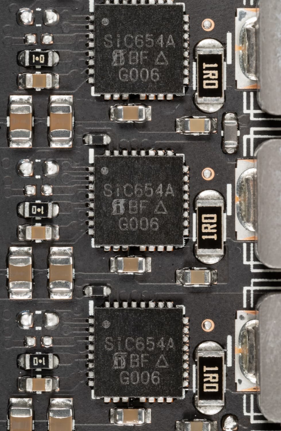 Схема питания ядра у карты Asus традиционно построена с применением технологии Super Alloy Power II, использованы современные твердотельные конденсаторы и транзисторные сборки DrMOS — в данном случае SiC654A (Vishay Siliconix), каждая из которых рассчитана максимально на 50 А.