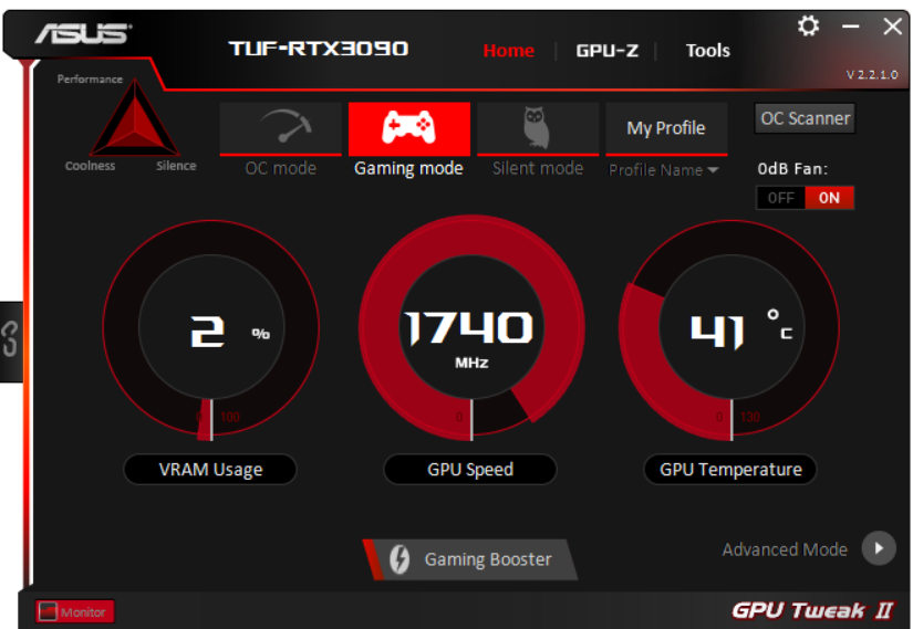 Штатные частоты памяти у карты Asus равны референсным значениям, а частота работы ядра в режиме по умолчанию (Gaming mode) лишь чуть выше (на 1,2%), но зато OC Mode поднимает частоту на 3,7% относительно референсных величин. Я попробовал ручной разгон, TDP можно поднять лишь до 110%, так что, скорее всего, драйверы ограничат разгон привычными 3%-5% прироста производительности вне зависимости от установки частот. Я попытался выставить +120 МГц по ядру и +750 МГц по памяти, что дало максимальные частоты в 2145/21000 МГц, это на 7,5% выше референсных величин.