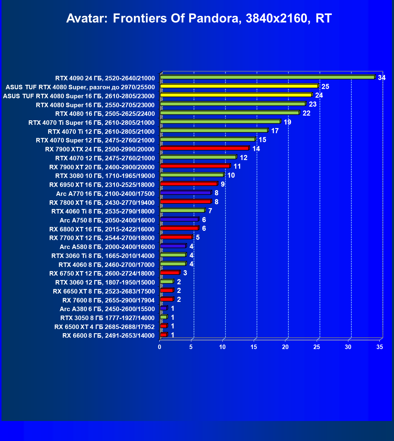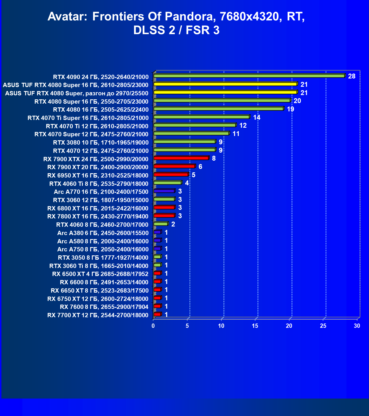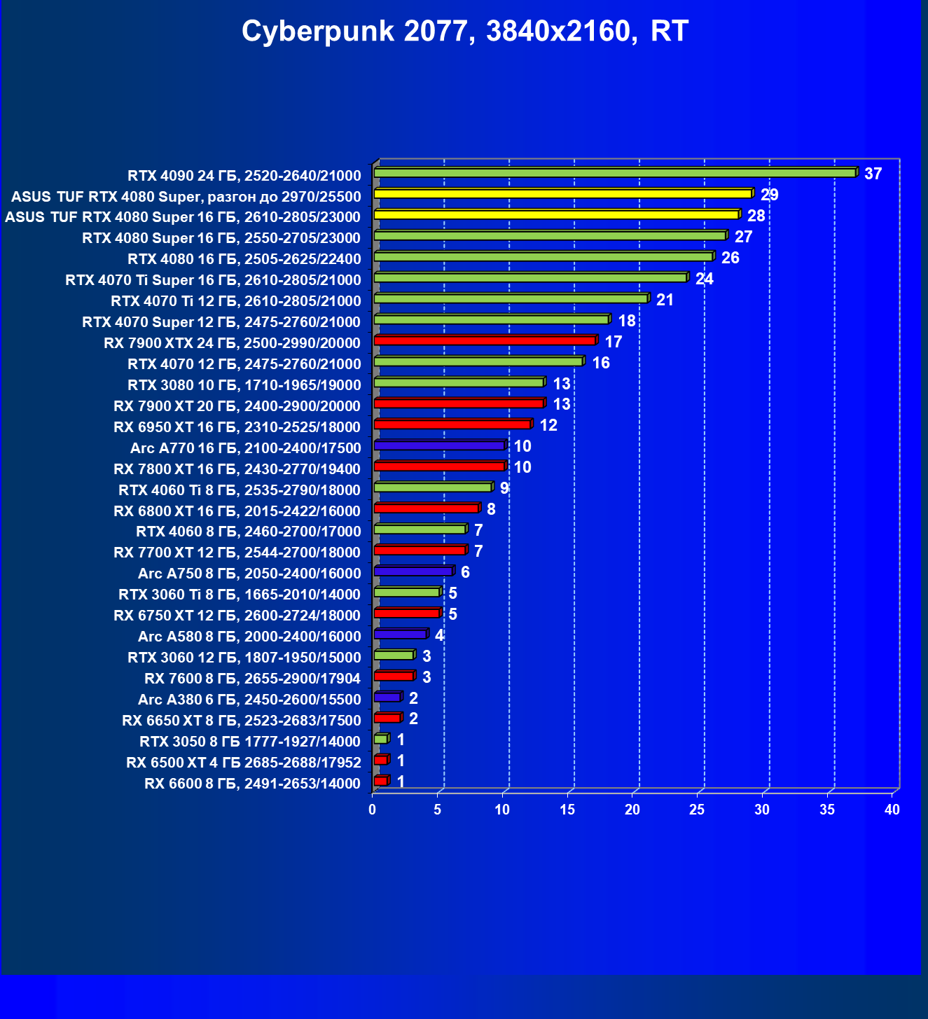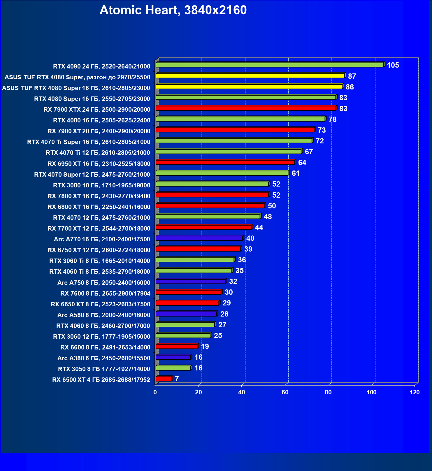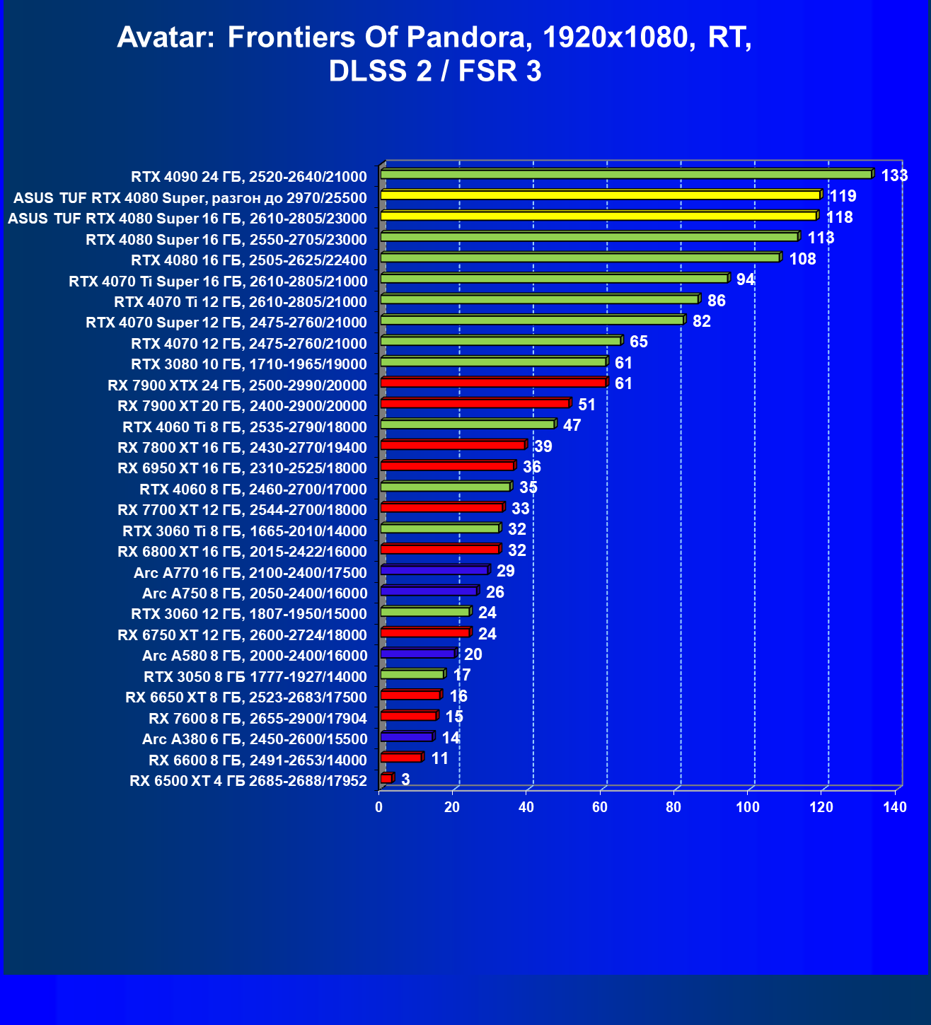 | 11 | Asus TUF RTX 4080 Super, разгон до 2970/25500 | 238 | 3218 | 135 000 |