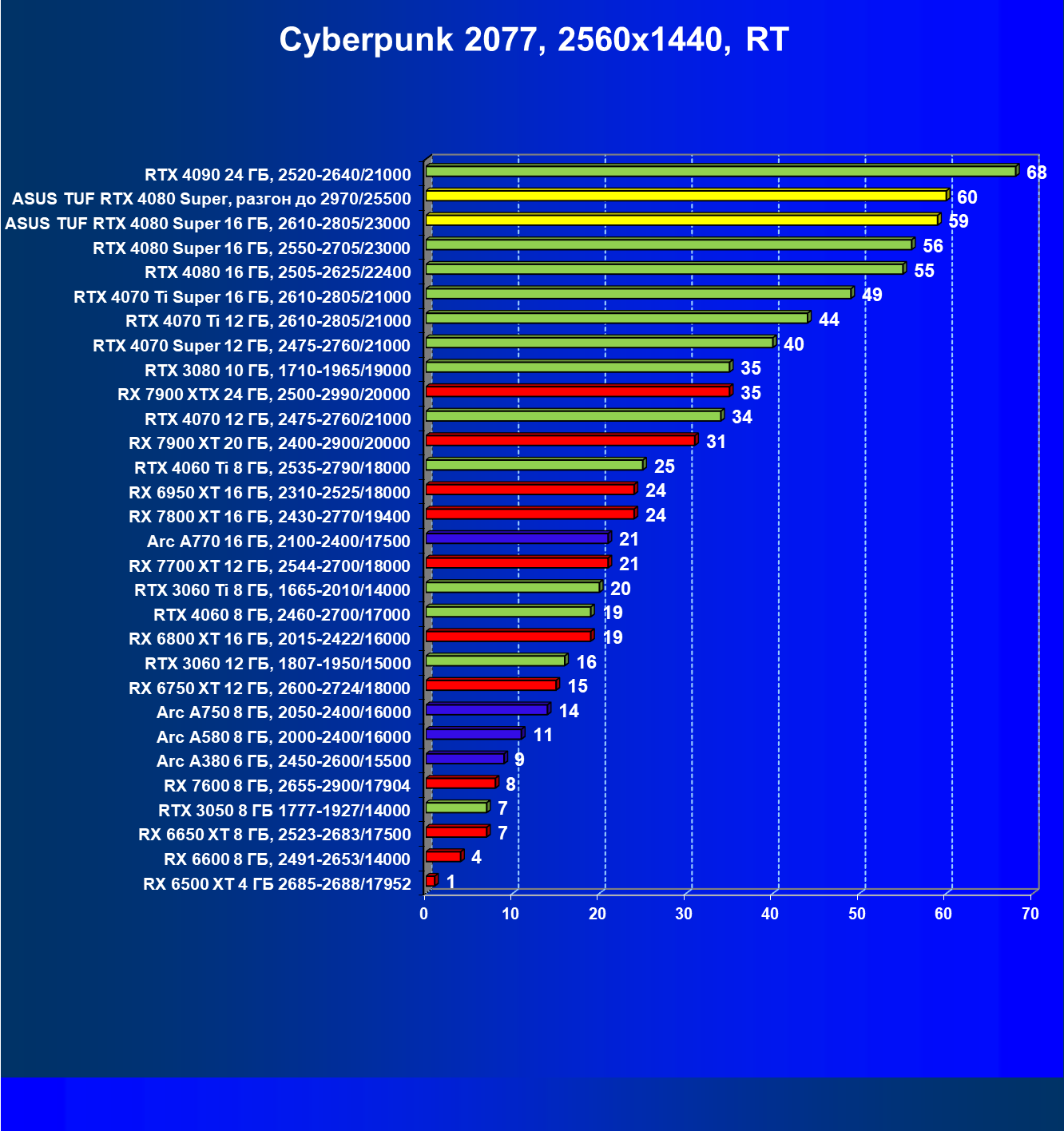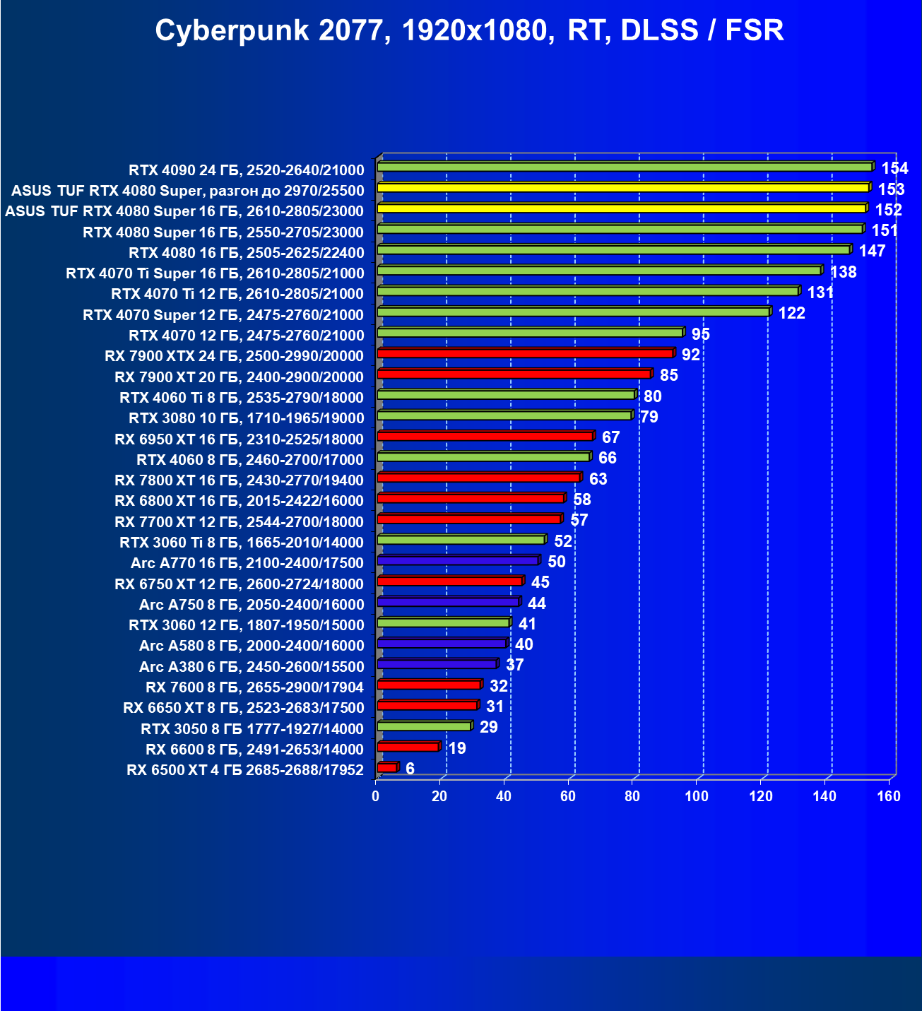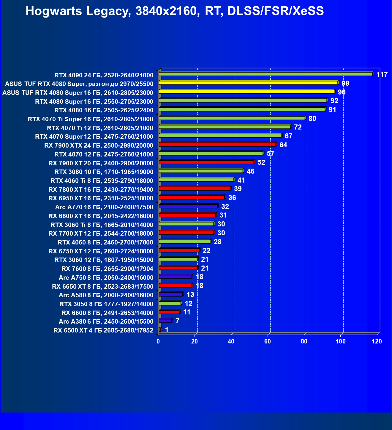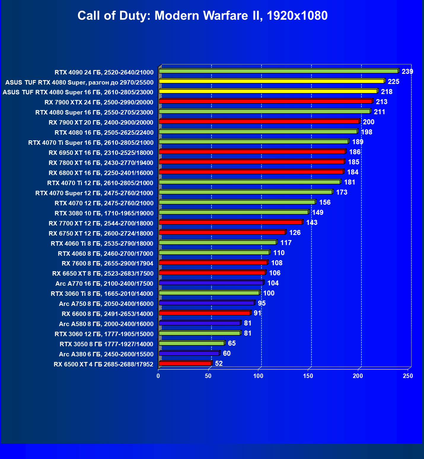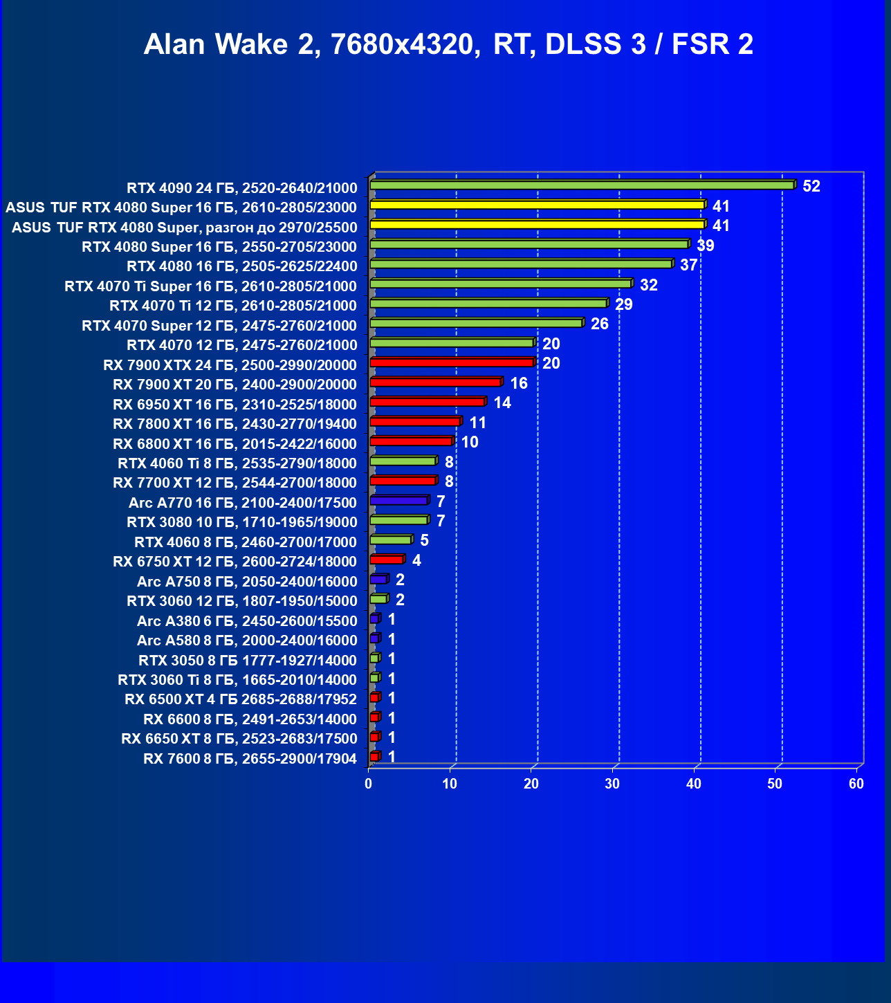 | 11 | Asus TUF RTX 4080 Super, разгон до 2970/25500 | 238 | 3218 | 135 000 |