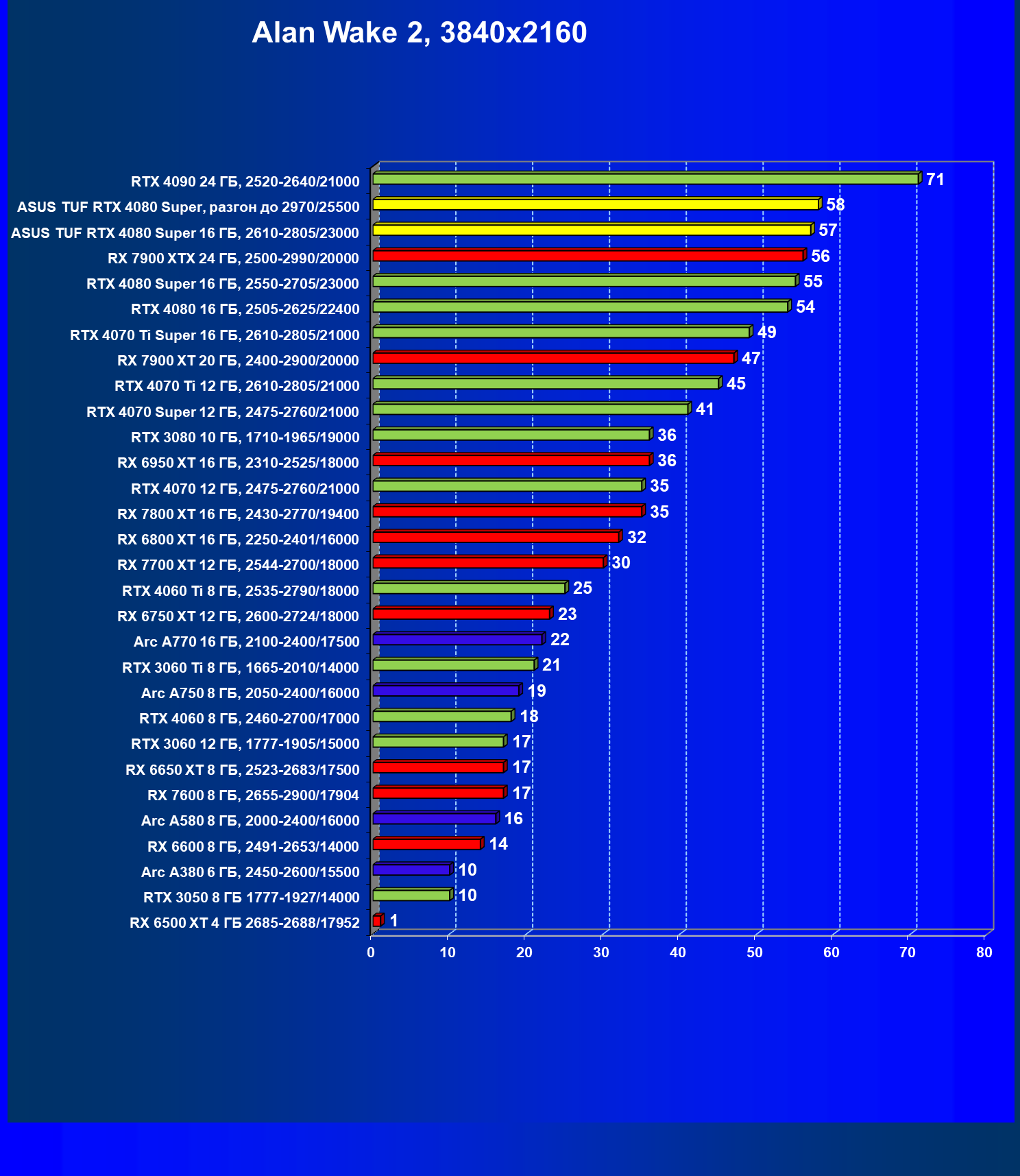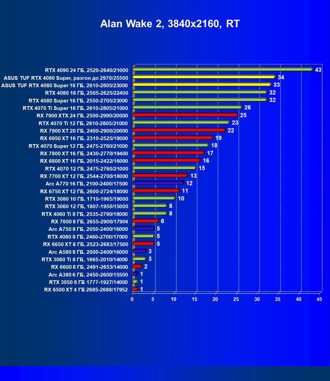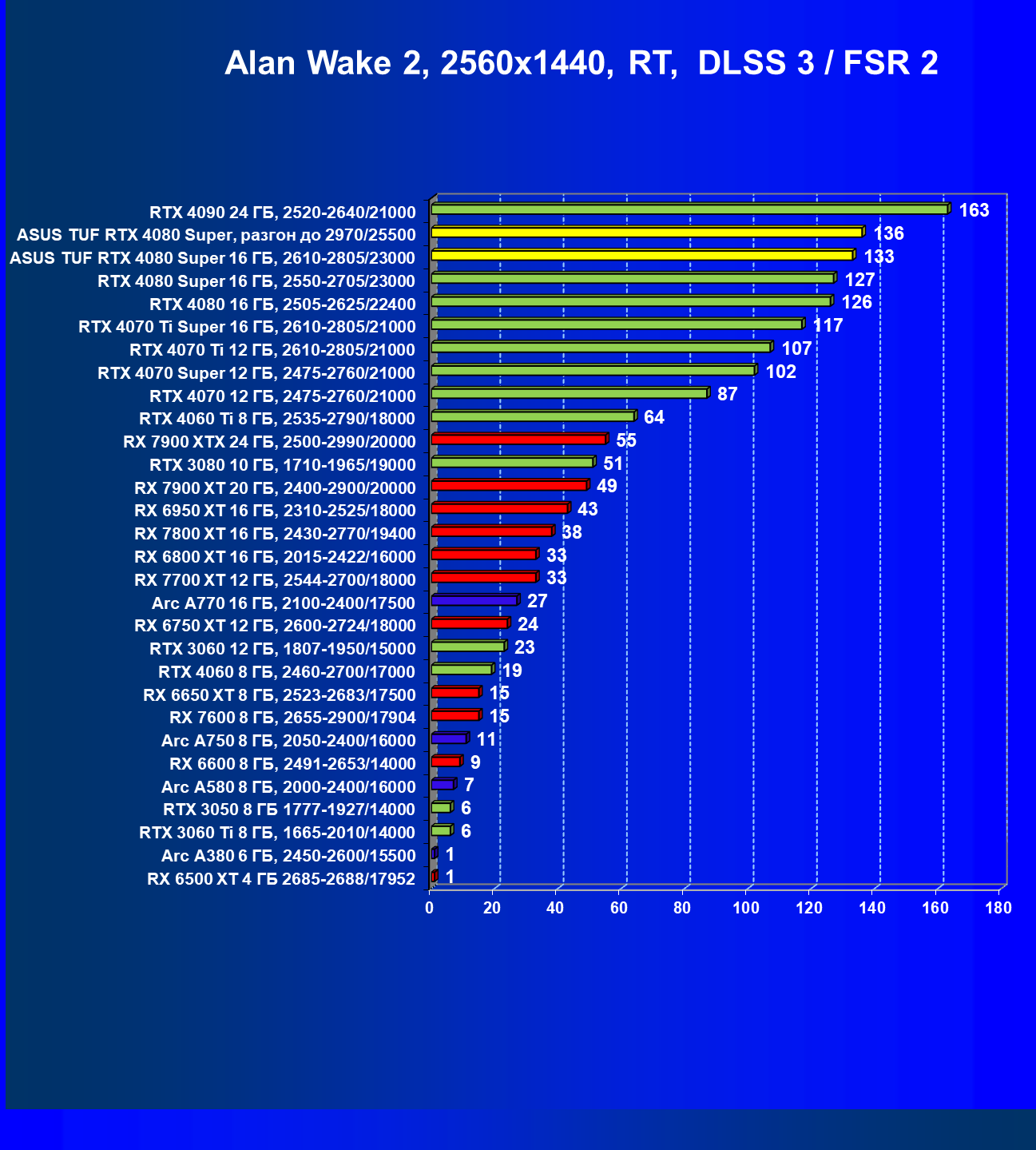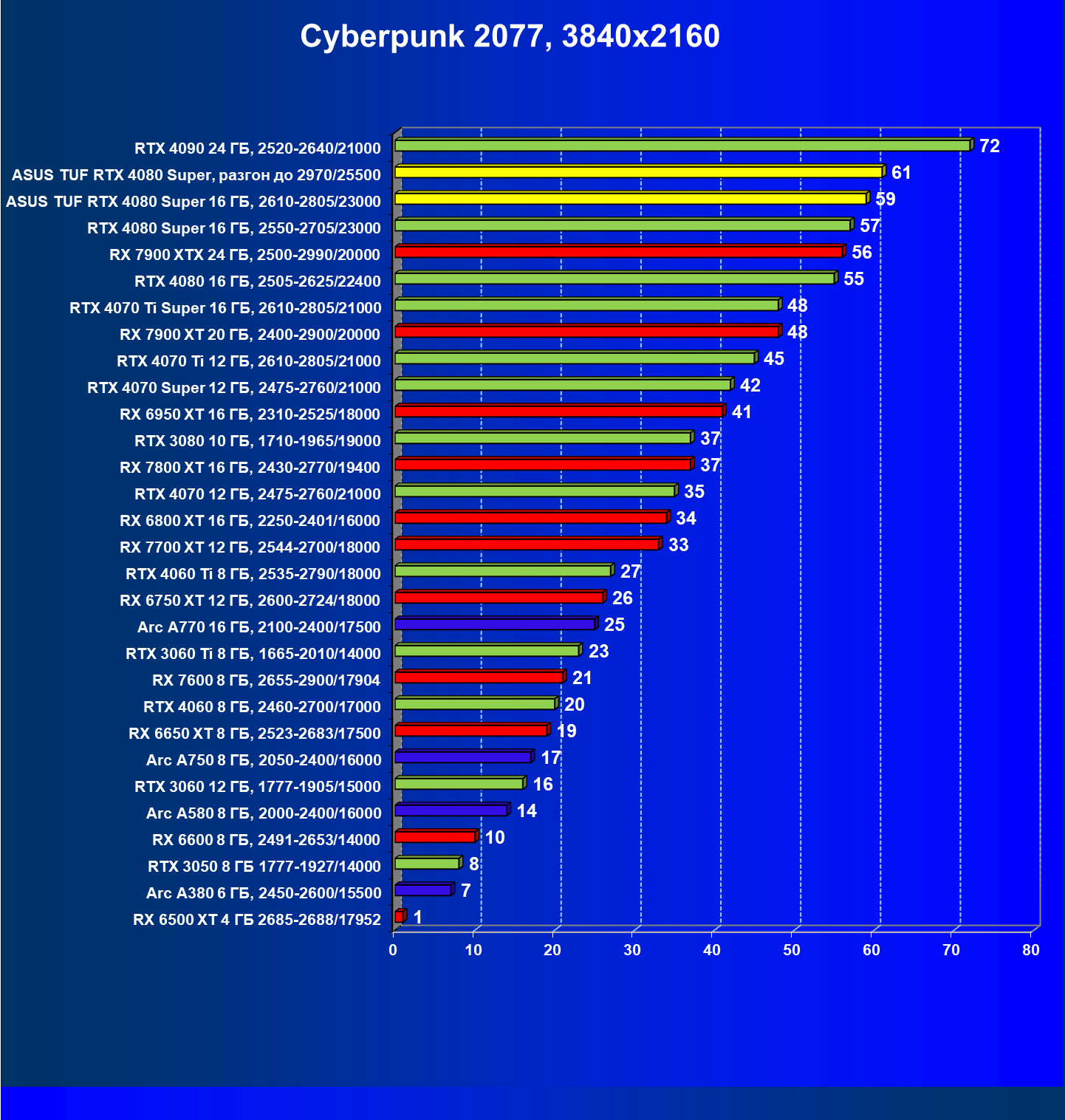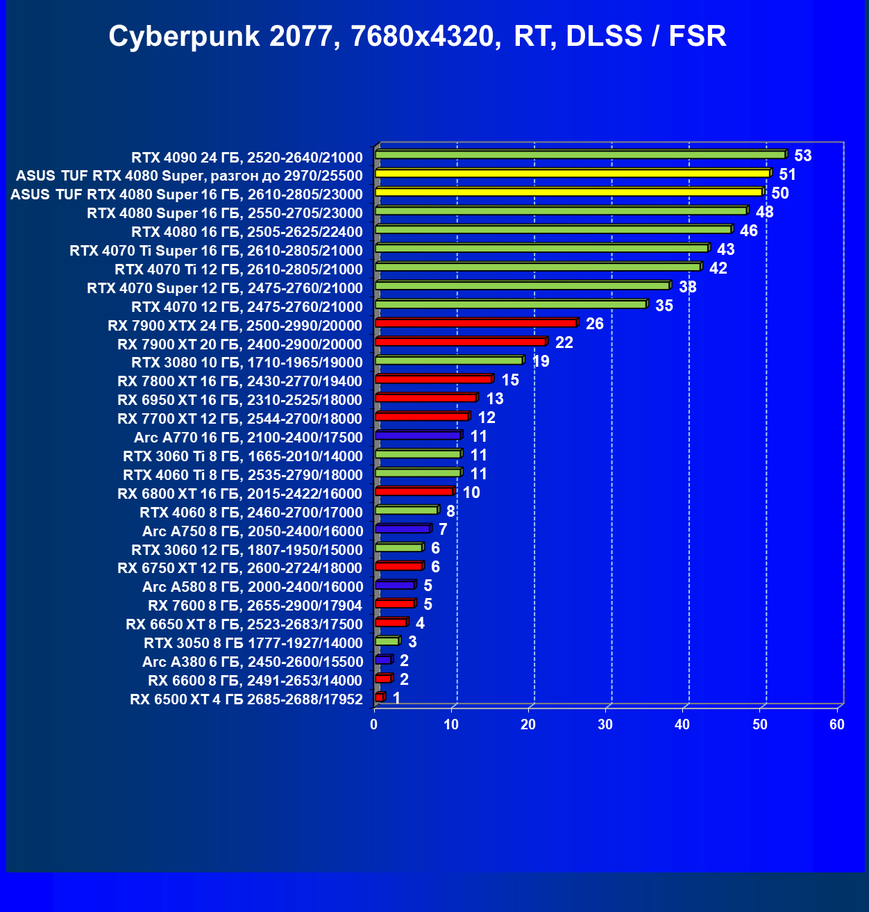 | 11 | Asus TUF RTX 4080 Super, разгон до 2970/25500 | 238 | 3218 | 135 000 |