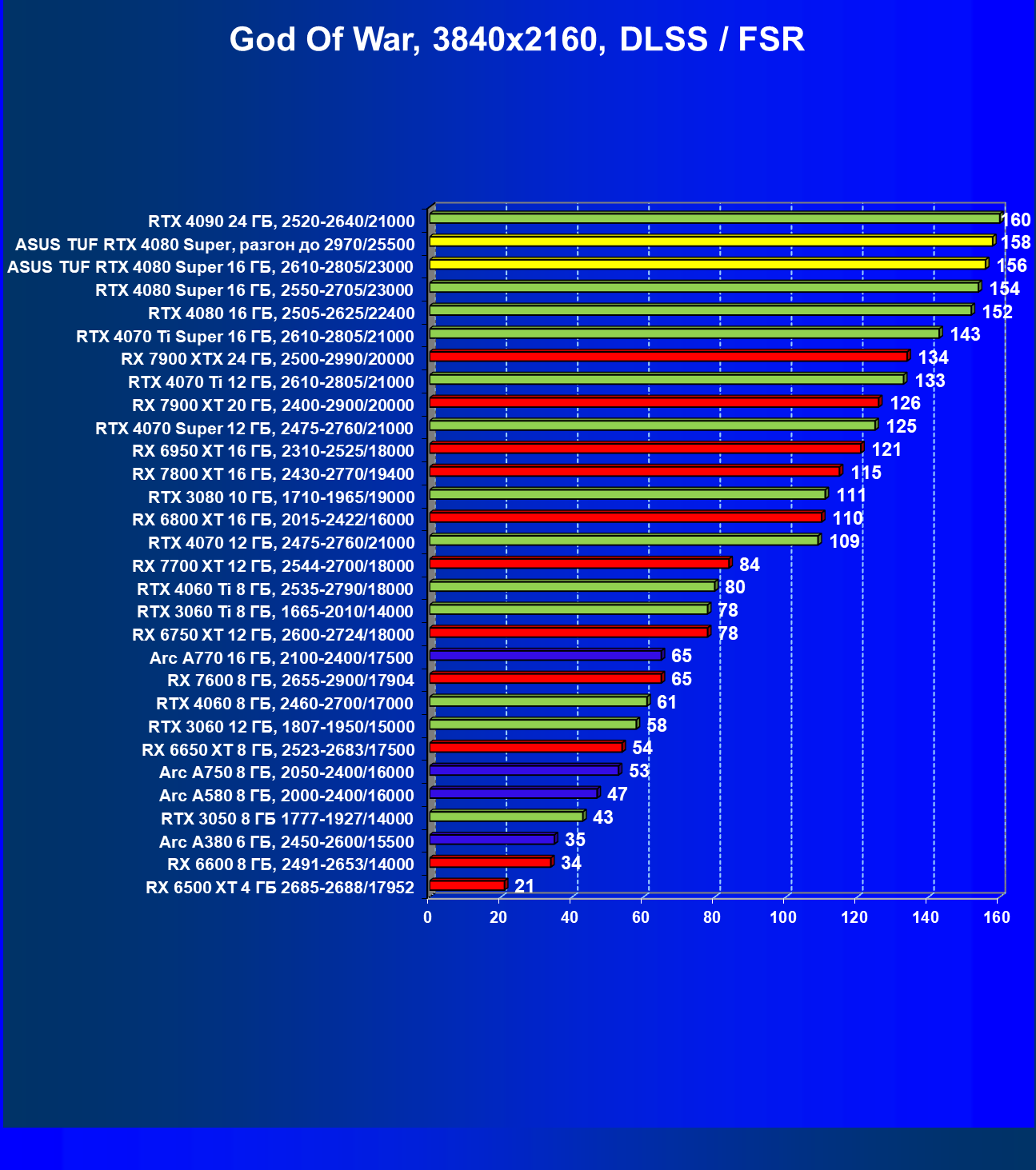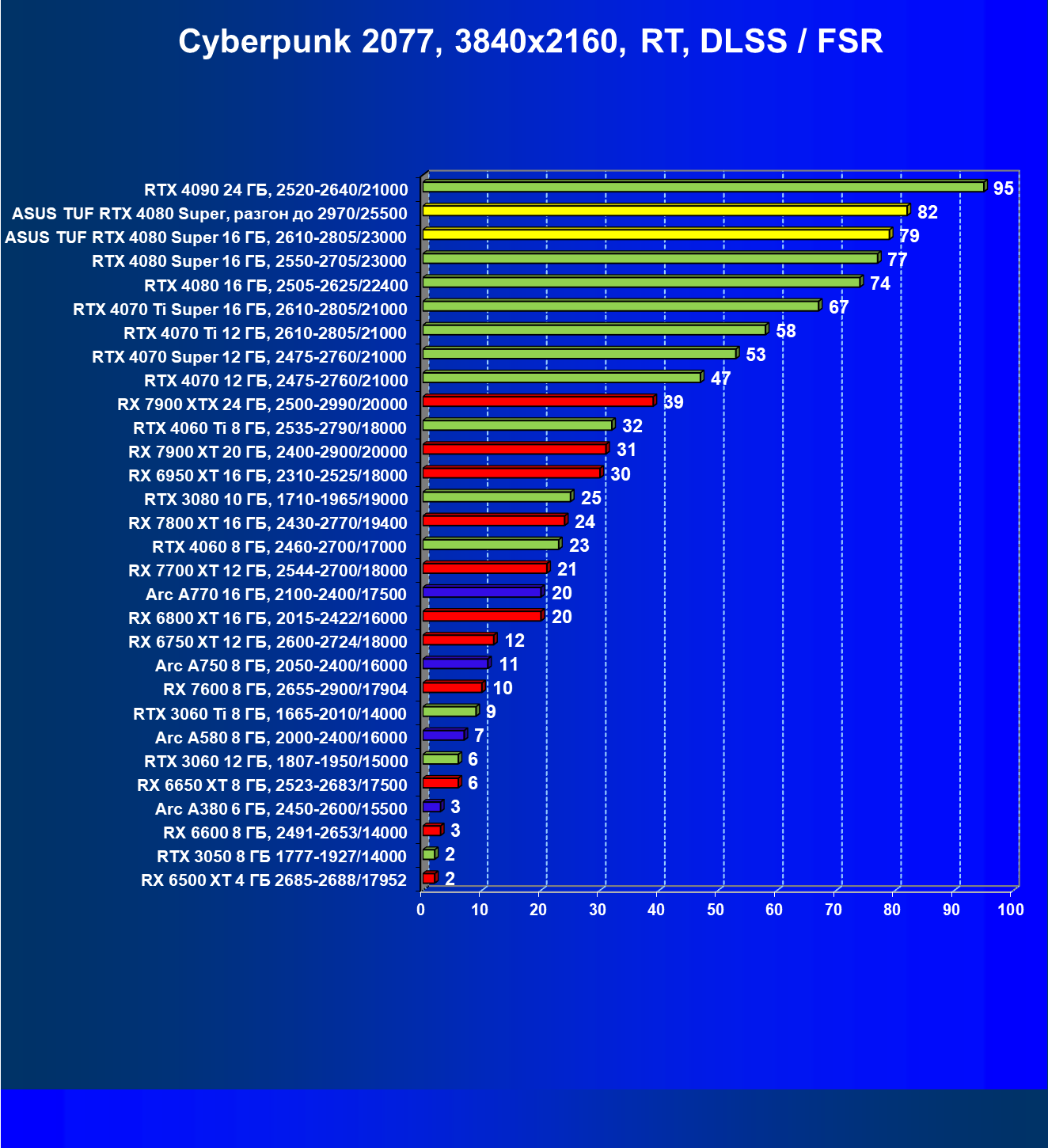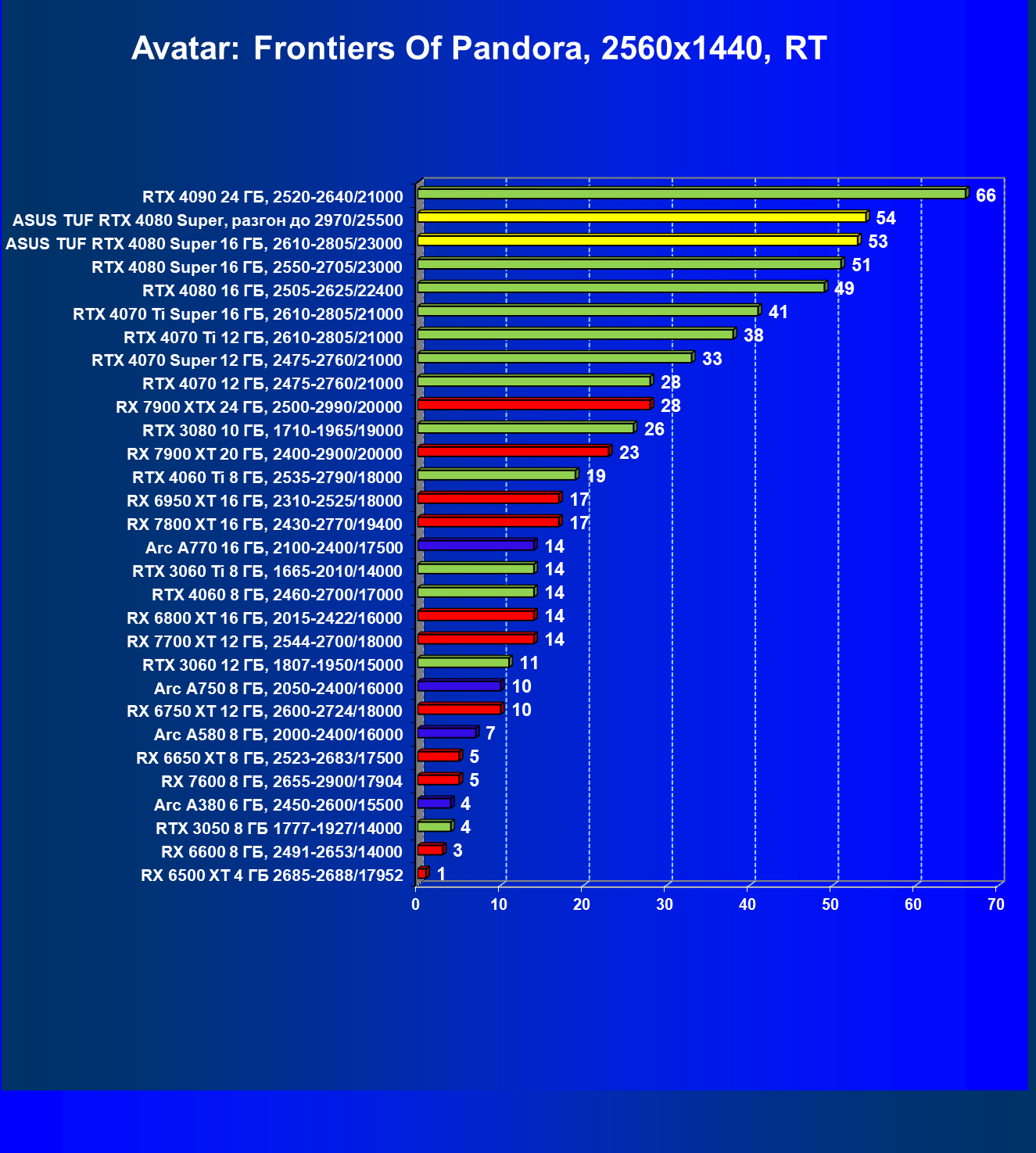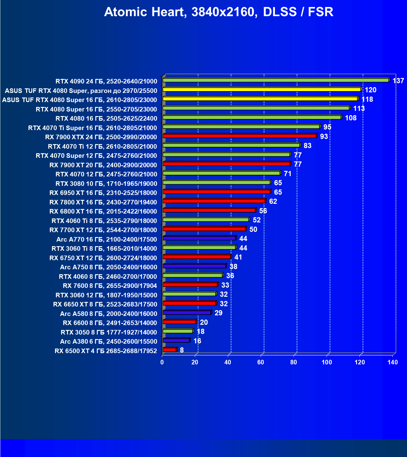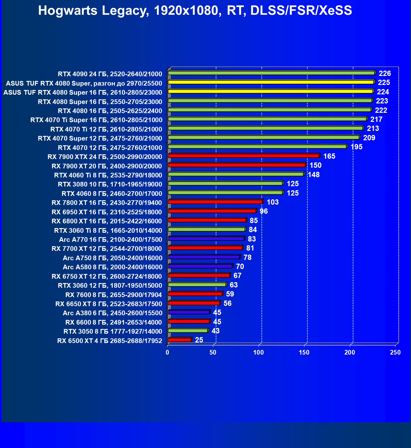 | 11 | Asus TUF RTX 4080 Super, разгон до 2970/25500 | 238 | 3218 | 135 000 |